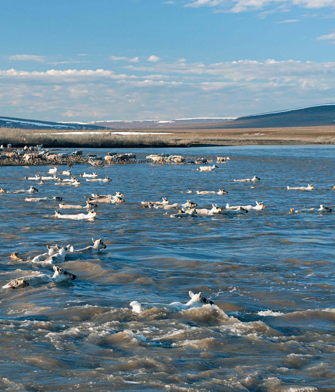 アラスカ最大のカリブーの群れのひとつであるポーキュパイン・カリブー群は、 毎年、ブルックス山脈の北にある安全な海岸平野で次の世代を出産する ために、ある推定では最長約2,400キロメートルにもおよぶ長旅をする。 何千年ものあいだ、みずからを「カリブーの人びと」と呼ぶグウィッチン族は、 ポーキュパイン群の移動経路に沿って生活を営み、食料、資源、そして 伝統文化をカリブーに頼り、崇拝してきた。