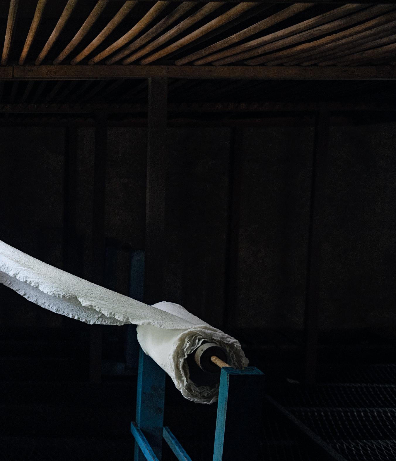 工場の上層階でユーレックスのシートを 空気乾燥させるラジェシュワリ。これは 生産工程における重要なステップ。