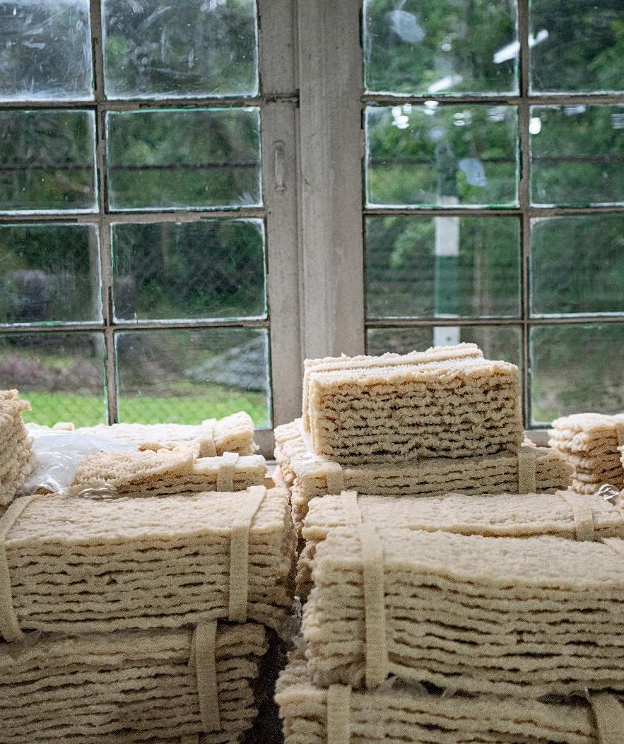 〔上〕工場での加工処理における最終段階のひとつ。 ユーレックス天然ラバーのシートはロール状に巻かれ、 小さな四角にカットされ、輸送準備に入る。
