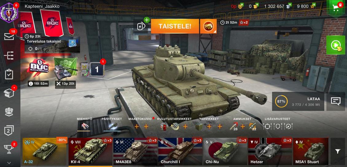 Latausruudun jälkeen pääset ikiomaan panssarivaunutalliisi, jossa pääset katselemaan vaunuvalikoimaa. Omista mieltymyksistäsi riippuen voit ryhtyä kehittämään kantikkaita kulmia ja suurta tornikokoa suosivia Panzer-sarjan vaunuja, tai jos pidät enemmän pyöreistä muodoista sekä terhakkaista tykeistä kannattaa aloittaa ennemmin neuvostovalmisteisista t-sarjan vaunuista. Kuvassa esillä oleva KV-4 edustaa omalla röyhkeällä
