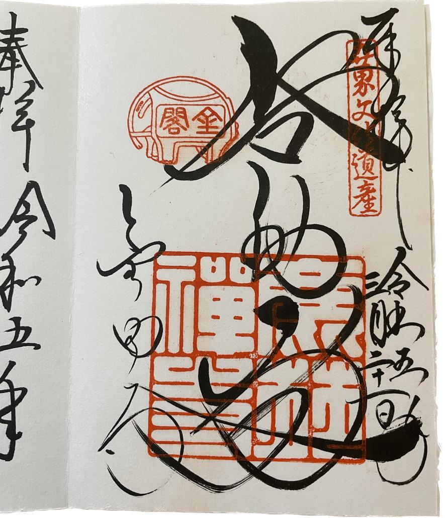 Kinkaku-jina tunnettu Rokuon-ji on kuuluisa Kiotossa majaileva kullattu temppeli Temppelin goshuin on oiva esimerkki siitä, että välillä kalligrafia on villimpää eikä luettavuus ole tärkeintä. Löytyy myös Unescon maailmanperintökohdelistalta niin kuin moni muukin paikka täällä Turistejakin oli riittämiin Myös norsu, jonka sisällä lukee ”kinkaku” on hauska yksityiskohta