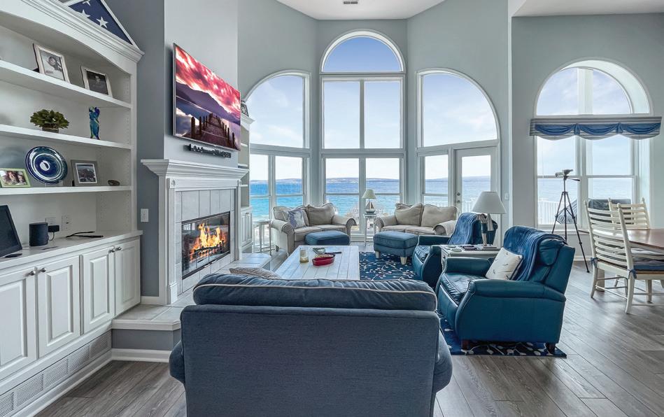 This remarkable estate is the epitome of modern luxury living, featuring impeccable finishes & a design that maximizes every square foot. From the moment you enter, panoramic views of Little Traverse Bay captivate, offering stunning vistas from every room. The home blends elegance with exceptional craftsmanship, showcasing custom details at every turn. The floating walnut staircase makes a dramatic first impression, leading to a living area centered around a two-way stone fireplace, providing both warmth & a refined atmosphere for intimate gatherings or larger events. The gourmet kitchen is a true highlight, designed by the award-winning KMB & Associates. It features top-of-the-line Wolf appliances, including a professional-grade range & double ovens, ensuring it is both a chef’s dream & a central gathering space. Outdoors, the estate boasts a blue stone patio with a fire pit perfect for relaxing & enjoying incredible sunsets over Little Traverse Bay. The adjacent lot offers added privacy, enhancing the park-like setting. An additional fire pit area invites you to unwind and enjoy the natural beauty surrounding the property. Inside, the home offers three private bedroom suites, each a peaceful retreat with spectacular views & luxurious finishes. Two guest powder rooms provide added convenience & privacy. The lower level includes a large family room, ideal for both relaxation and entertaining, with ample natural light & a welcoming ambiance. The two-and-a-halfcar heated garage is equipped with custom built-ins and plenty of storage, offering both functionality and organization. Perfectly located in the heart of Bay Harbor, the home is just a short walk from the Village’s shopping, dining, & cultural attractions, as well as the Bay Harbor Yacht Club for boating & social events. Offered fully furnished, the estate also includes a Generac generator, ensuring reliable power during outages. This home offers the perfect blend of luxury & comfort.