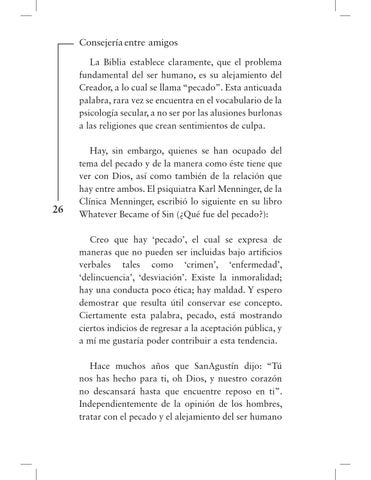 Hay, sin embargo, quienes se han ocupado del tema del pecado y de la manera como éste tiene que ver con Dios, así como también de la relación que hay entre ambos. El psiquiatra Karl Menninger, de la Clínica Menninger, escribió lo siguiente en su libro Whatever Became of Sin (¿Qué fue del pecado?): Creo que hay ‘pecado’, el cual se expresa de maneras que no pueden ser incluidas bajo artificios verbales tales como ‘crimen’, ‘enfermedad’, ‘delincuencia’, ‘desviación’. Existe la inmoralidad; hay una conducta poco ética; hay maldad. Y espero demostrar que resulta útil conservar ese concepto. Ciertamente esta palabra, pecado, está mostrando ciertos indicios de regresar a la aceptación pública, y a mí me gustaría poder contribuir a esta tendencia. Hace muchos años que SanAgustín dijo: “Tú nos has hecho para ti, oh Dios, y nuestro corazón no descansará hasta que encuentre reposo en ti”. Independientemente de la opinión de los hombres, tratar con el pecado y el alejamiento del ser humano