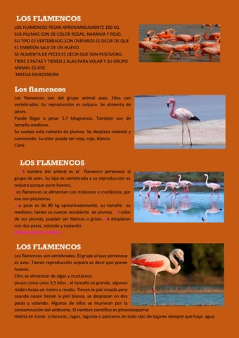 Los flamencos Los flamencos son del grupo animal aves. Ellos son vertebrados. Su reproducción es ovípara. Se alimenta de peces. Puede llegar a pesar 2,7 kilogramos. También son de tamaño mediano. Su cuerpo está cubierto de plumas. Se desplaza volando y caminando. Su color puede ser rosa, rojo, blanco. Ciara