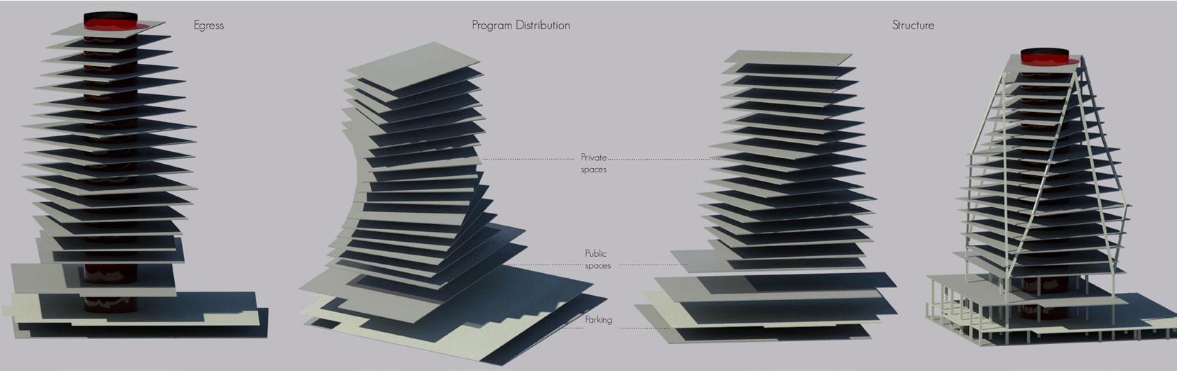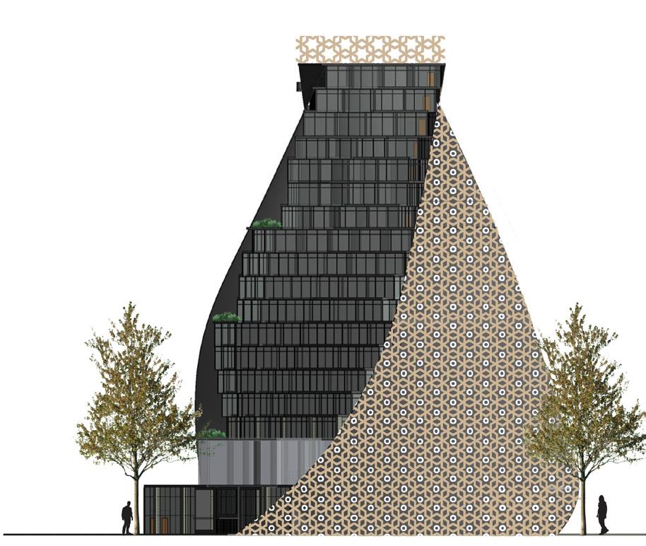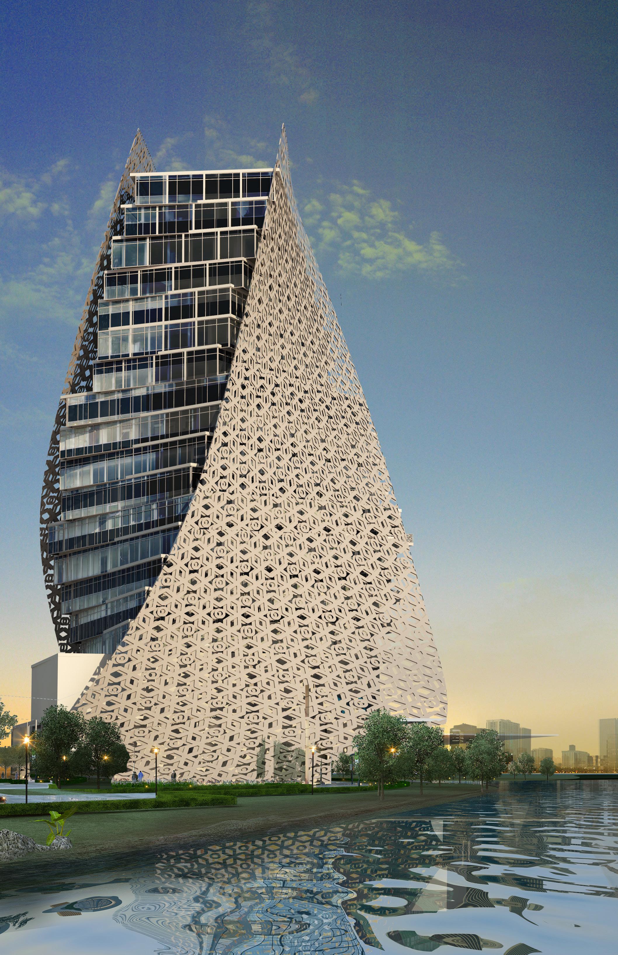The building twists from the west side to the topmost floor as water is the driving force of the design. The twist also helps in shading the building on the west side as the summer gets extremely hot in chennai. The exterior shell on the building acts as a double skin to the building.