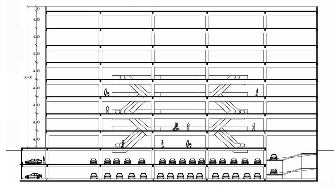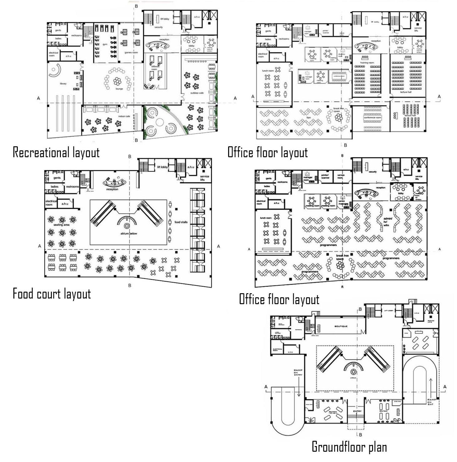 This project is a combination of a Shopping complex and an Office. The office space is seperated from the shopping complex with a food court in the center as it acts as a buffer between the two contrasting spaces. The first three floors are dedicated to the shopping complex and the upper two floors are for the office spaces. The building also has a roof top restaurant as well.