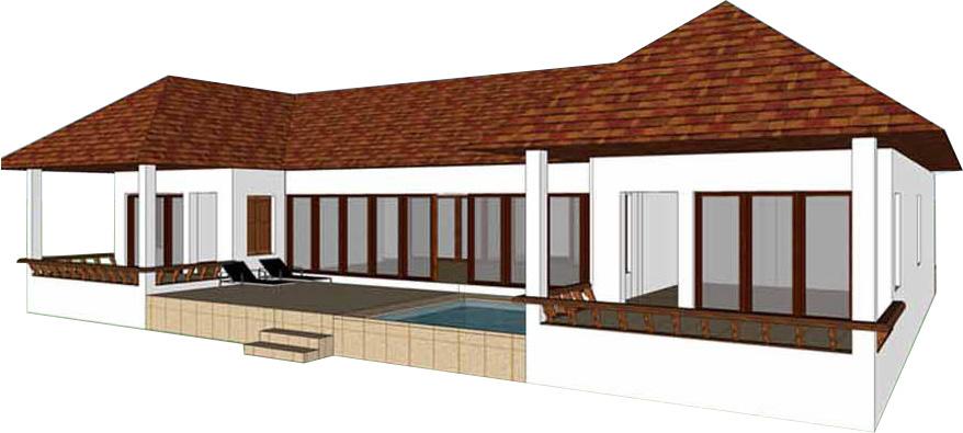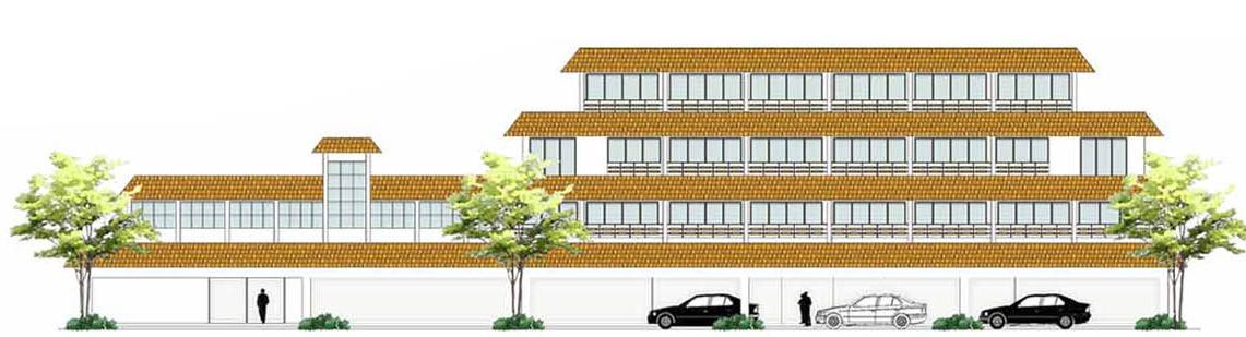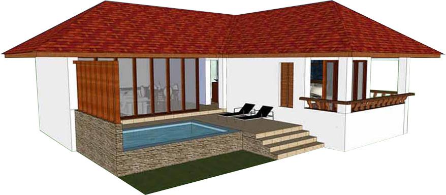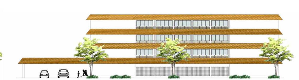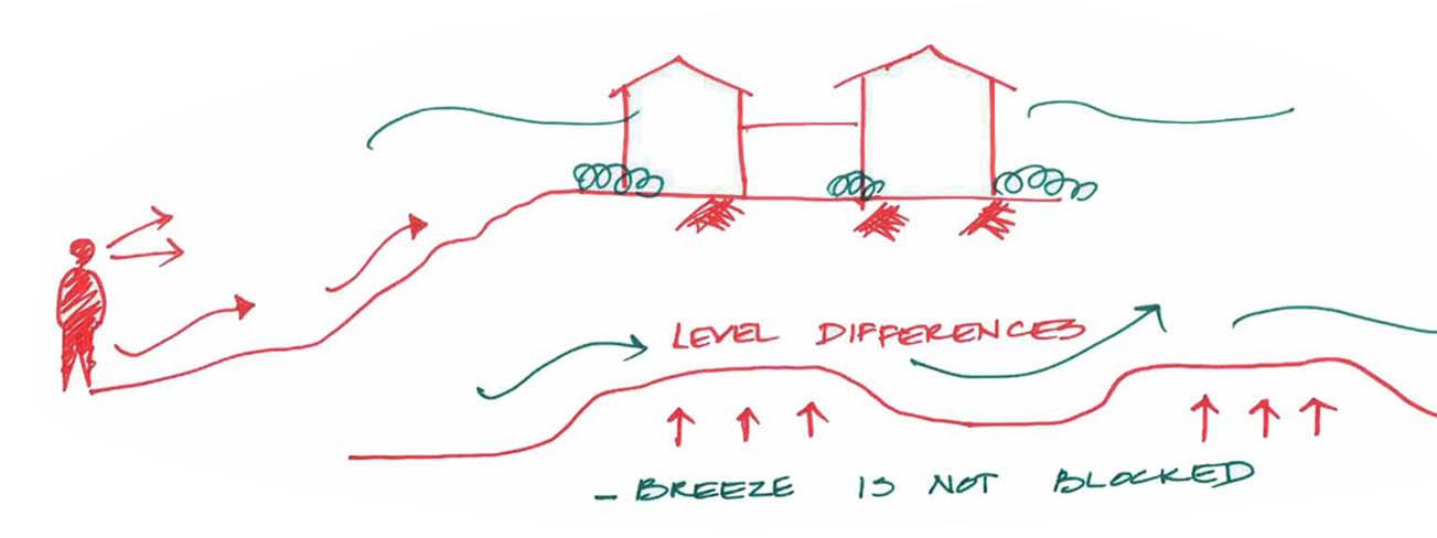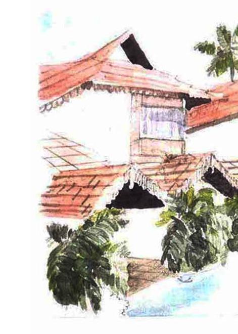 Use of sloped roofs and local materials to bring out the culture and tradition of Kerala.