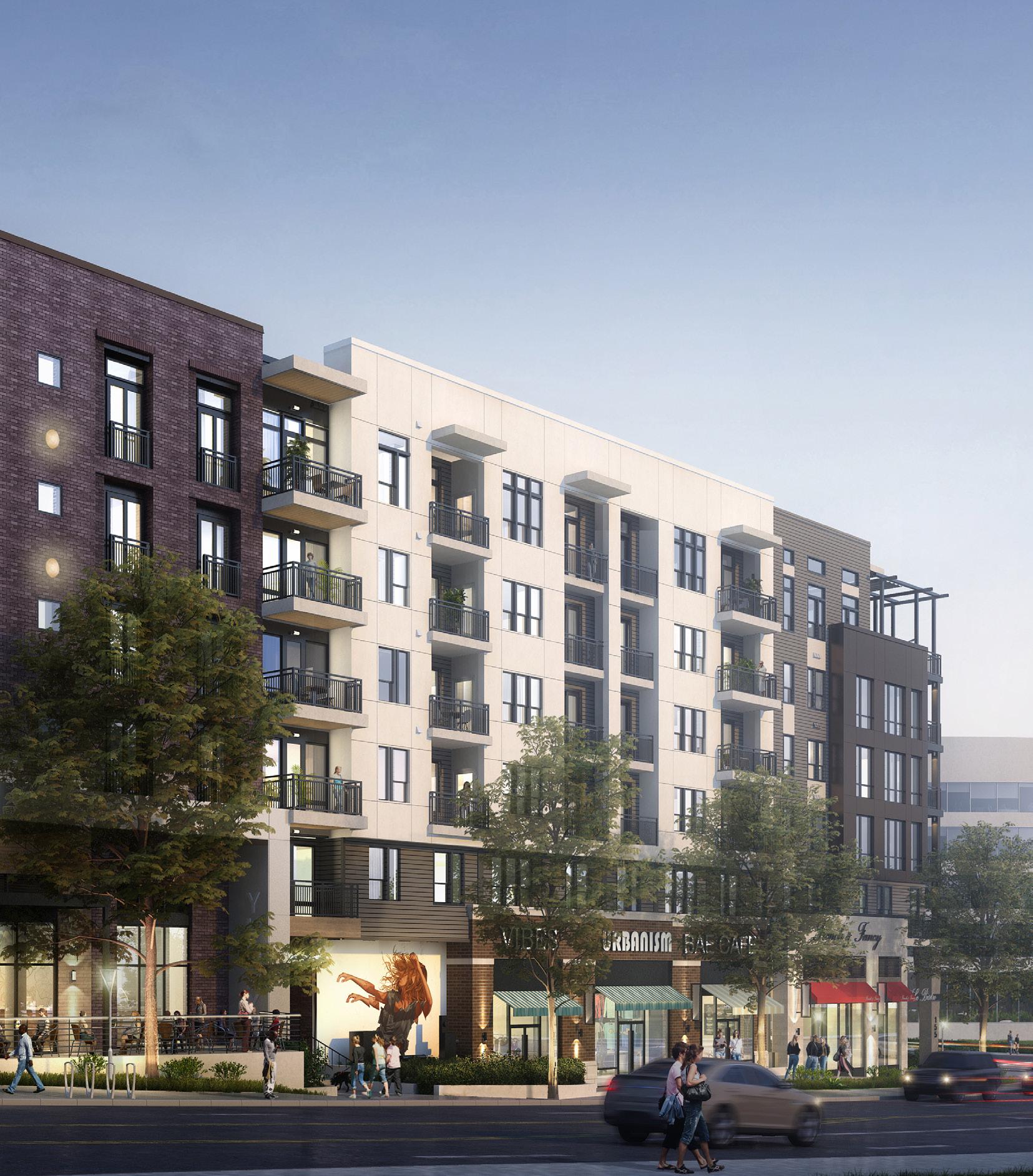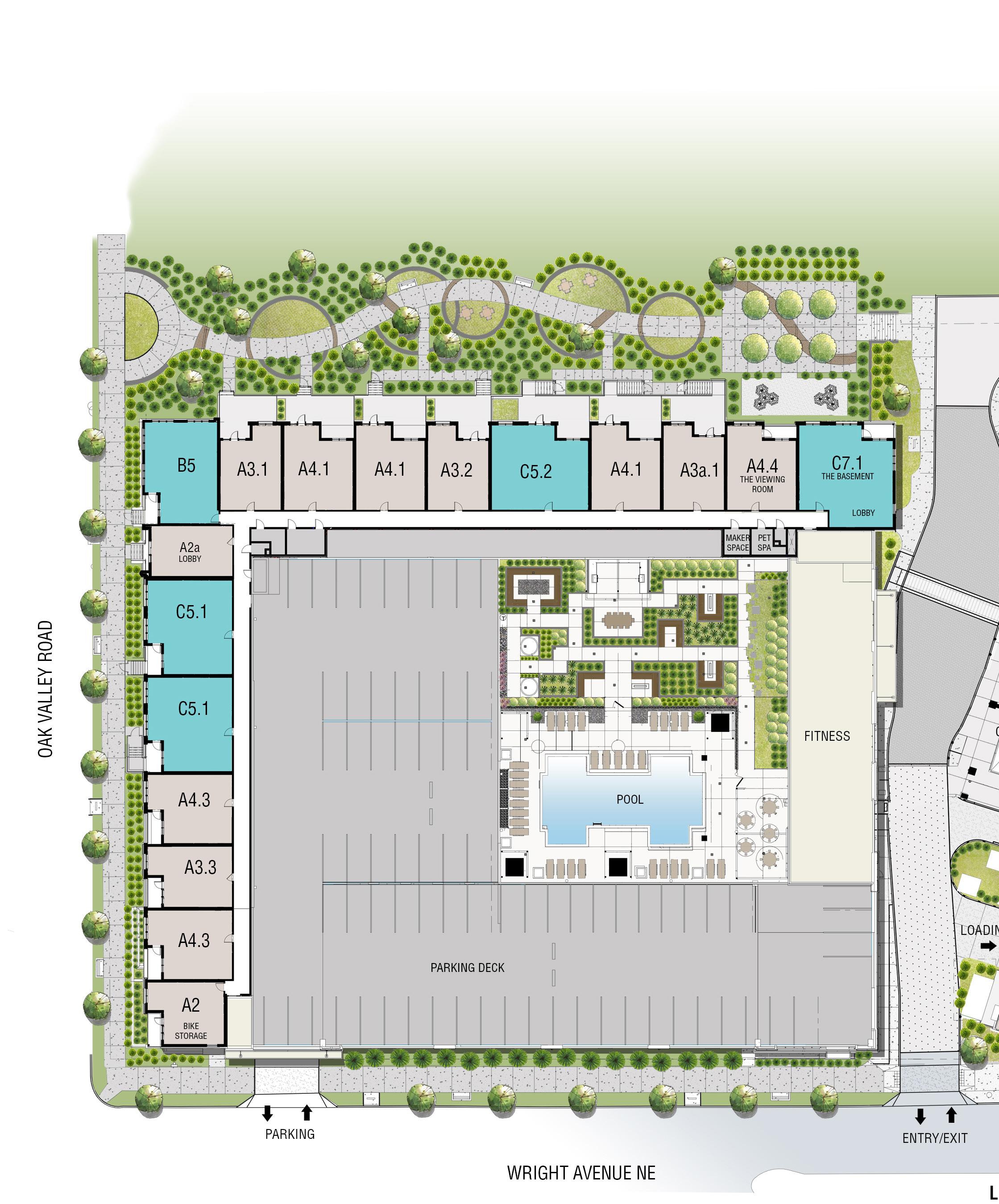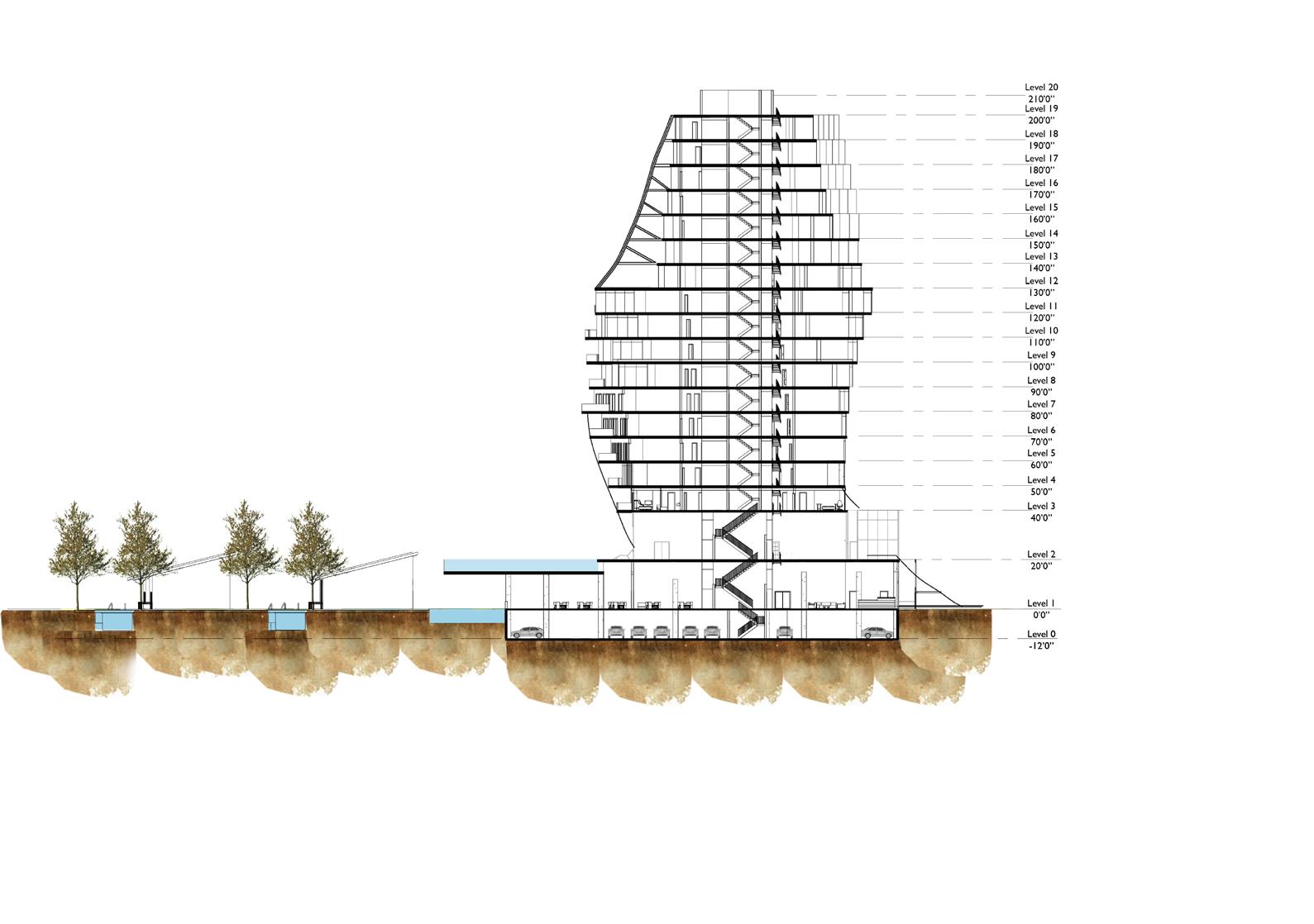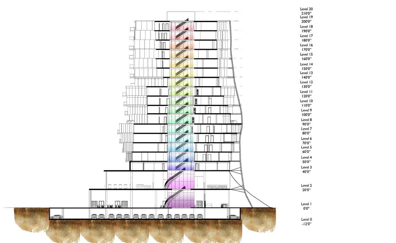 The project consists of a minimal amount of retail to meet the cities desire for active use on the ground floor or that the leasing office is located on the ground floor and qualifies as the required active use. An elevated pool and sun deck is located above the parking structure with adjacent fitness center, and community spaces. The top most levels houses penthouse floors