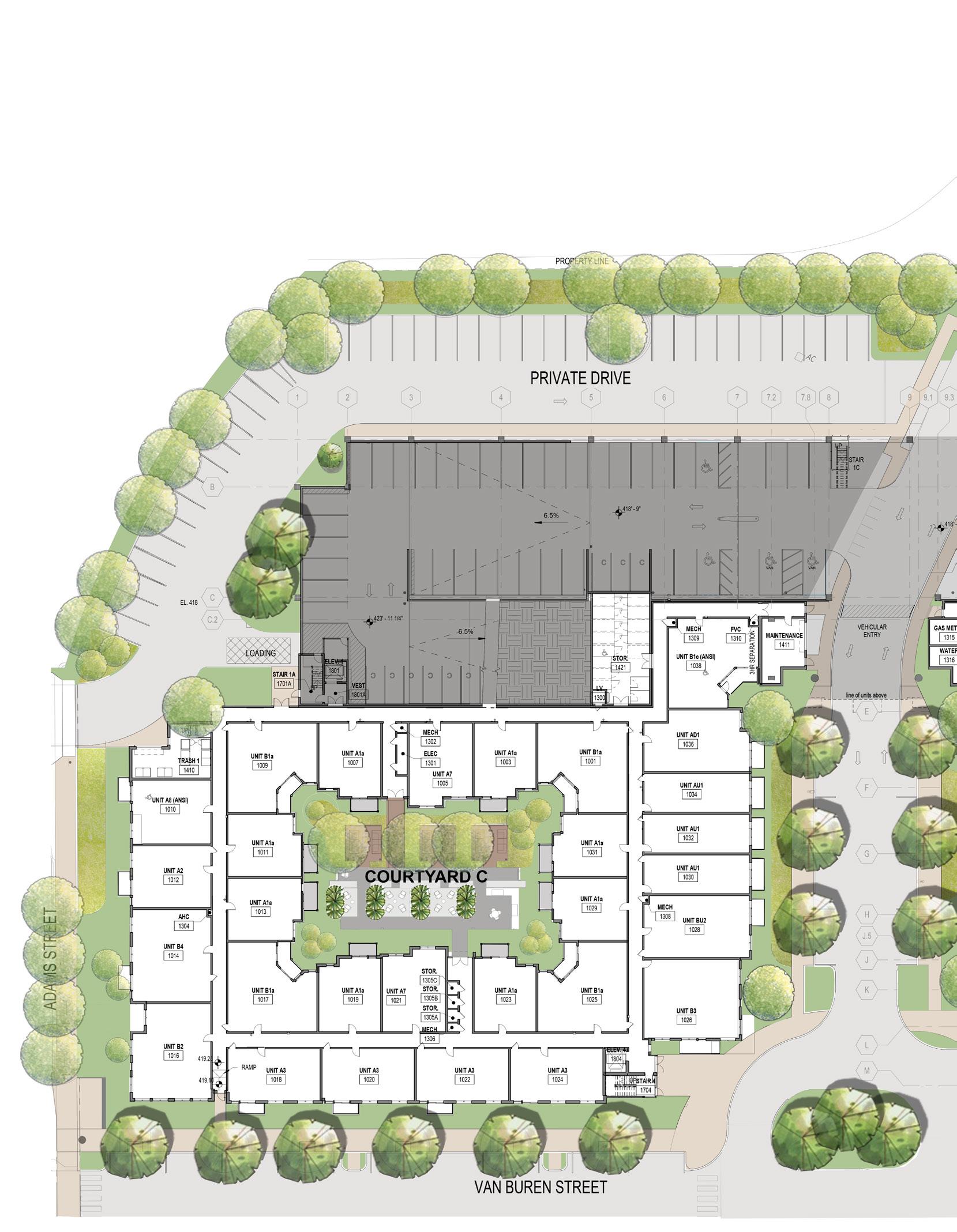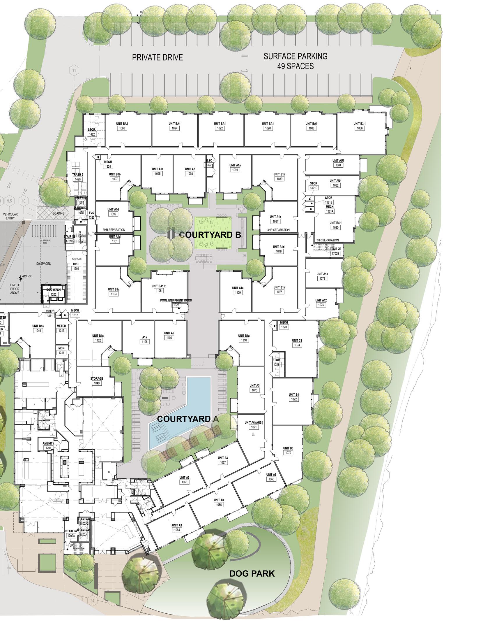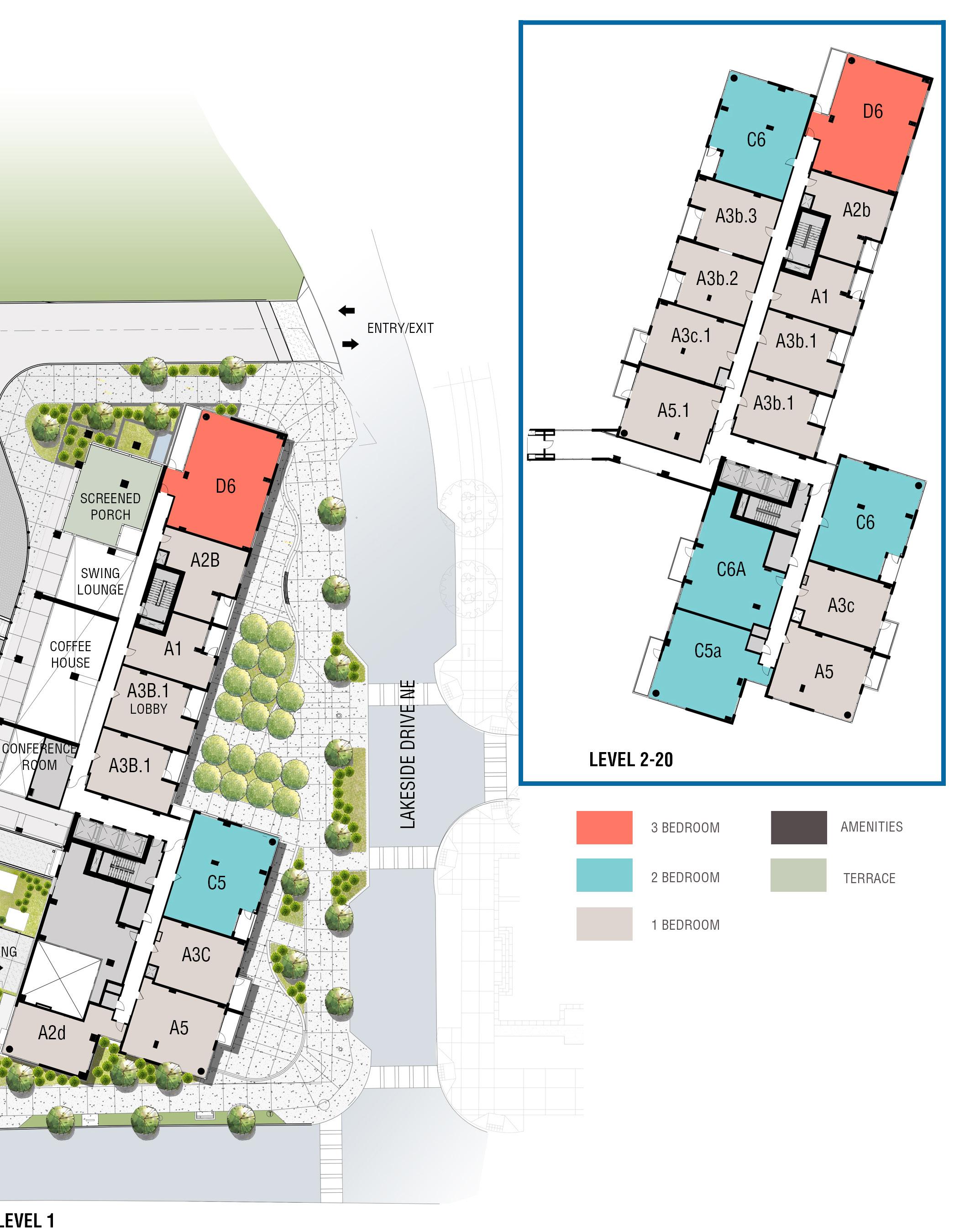 The project consists of a minimal amount of retail to meet the cities desire for active use on the ground floor or that the leasing office is located on the ground floor and qualifies as the required active use. An elevated pool and sun deck is located above the parking structure with adjacent fitness center, and community spaces. The top most levels houses penthouse floors