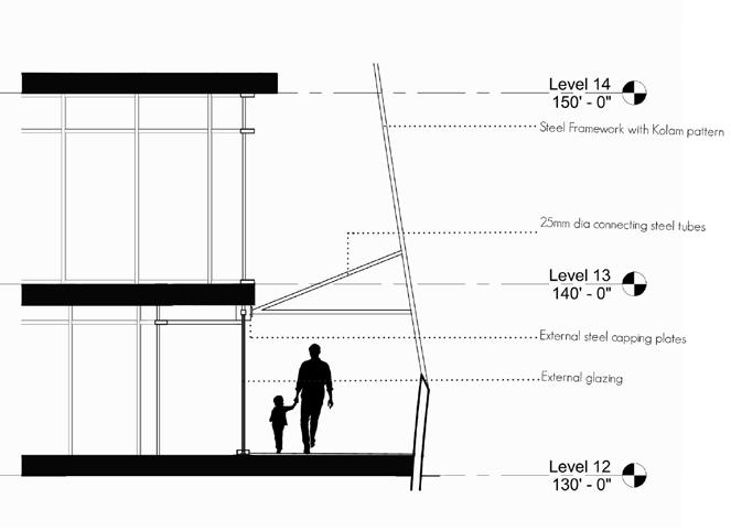 Chennai, is the capital city of Tamil Nadu and is located on the Coromandel Coast, off the Bay of Bengal. It is Indias fourth largest metropolitan city and the third largest commercial and industrial center. It is also known for its cultural heritage: rich in old traditions and religious diversity. The design concept is based on a KOLAM, fondly known as the floor plan of South India. It is a very prominent peace of art by the locals on the streets, especially in front of their houses.. Traditionally, the women of Tamil Nadu, in southeastern India, sweep their thresholds every morning, sprinkle them with water and cover the area with elaborate, symmetrical figures using rice powder. They trickle the rice powder in a stream between their middle and index fingers, using their thumbs to guide the flow of the powder. According to tradition, using the rice powder begins the day with an act of kindness by providing food for ants and other insects. Girls learn this kolam ritual from their female relatives, and kolam skills are viewed as a mark of grace and as a demonstration of dexterity, mental discipline and ability to concentrate.