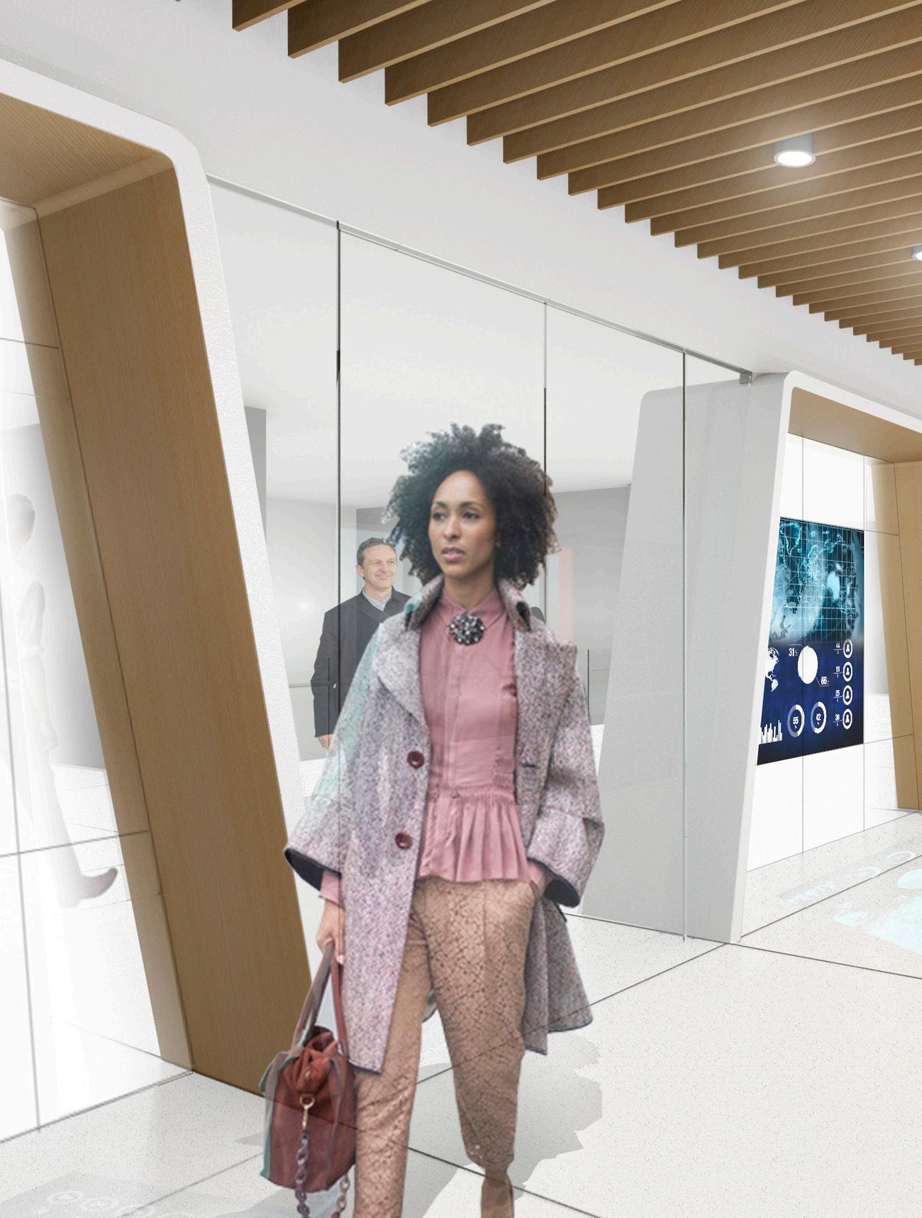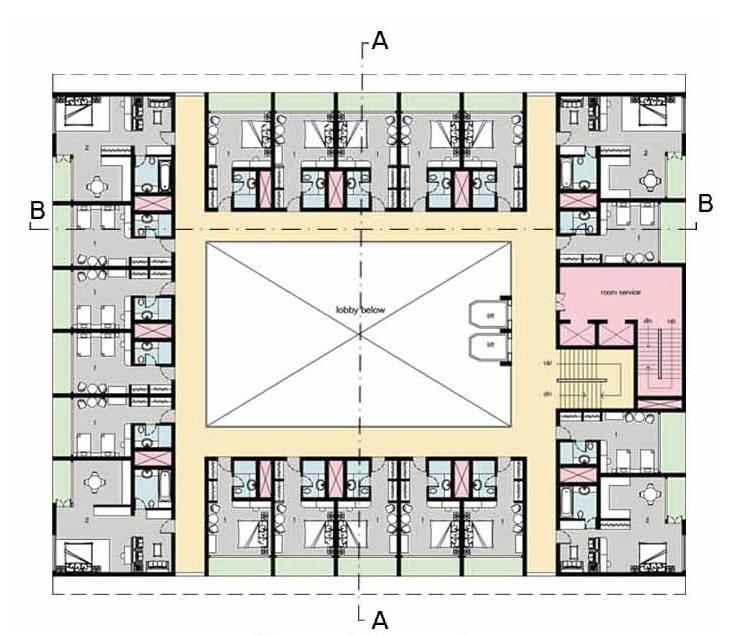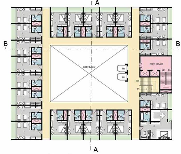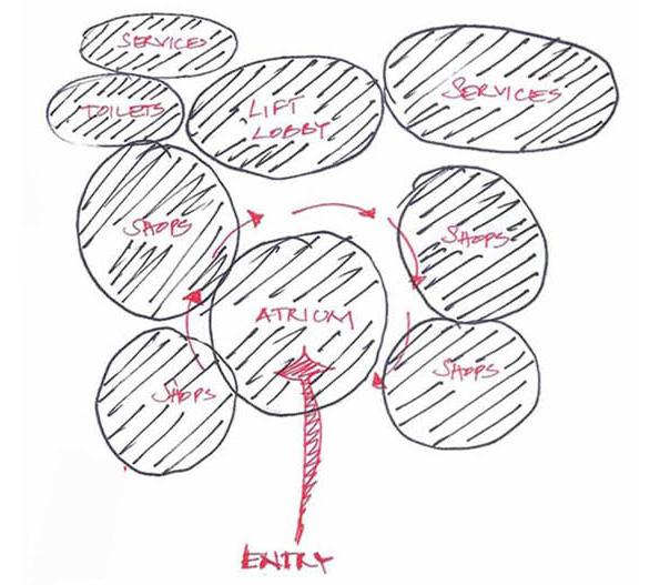 The planning of the complex is based on a central atrium. The shops are articulated around the atrium. The main entrance is grand and welcoming with a three storey height. The office is sealed off on the topmost from sound and other disturbances. The escalator stops on the food court so that people do not go to the office floor. The lifts are tucked behind the atrium so people using the office floors do not have to go through the shopping