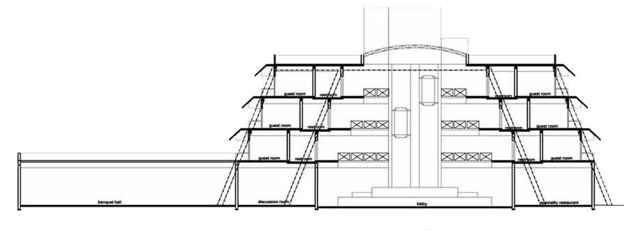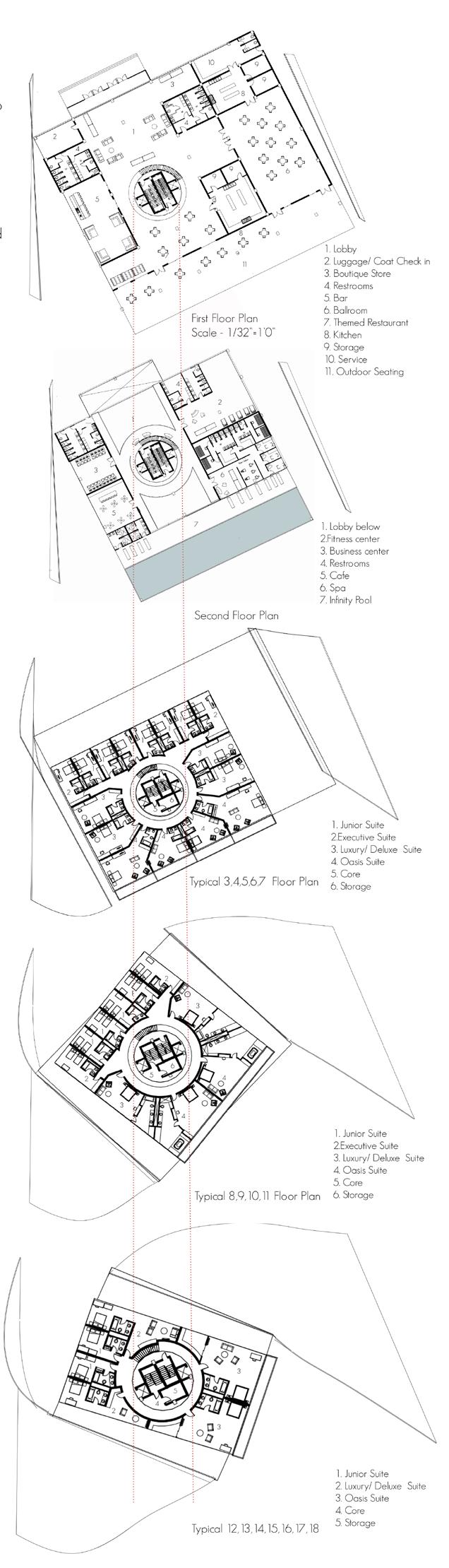 To attain a luxurious, exclusive yet an open and unforgettable experience , evoking the rich heritage of the city in terms of grandness and openness; opulent interiors, a milieu of exotic dining rooms, premium lounge spaces, spa and a perfect setting for business and leisure travellers. The main goal was to create an intimate, small, stylish setting combining historic details into chic elegance. The challenge was to unite traditional architecture with comfort and luxury of modernism without losing the personality of the local community. The design also focuses on taking advantage to the natural features surrounding the site like the adyar estuary which opens into the Bay of Bengal. The site also overlooks the “Broken Bridge”, a bridge that collapsed due to the strong currents of the water. The intent of the design is to allow guests to connection to this historical feature. The design is aligned along the axis of the bridge. A proposed deck connects from the site to the beach thus creating a visual and physical connection to the broken bridge. The building twists from the west side to the topmost floor as water is the driving force of the design. The twist also helps in shading the building on the west side as the summer gets extremely hot in chennai. The exterior shell on the building acts as a double skin to the building.