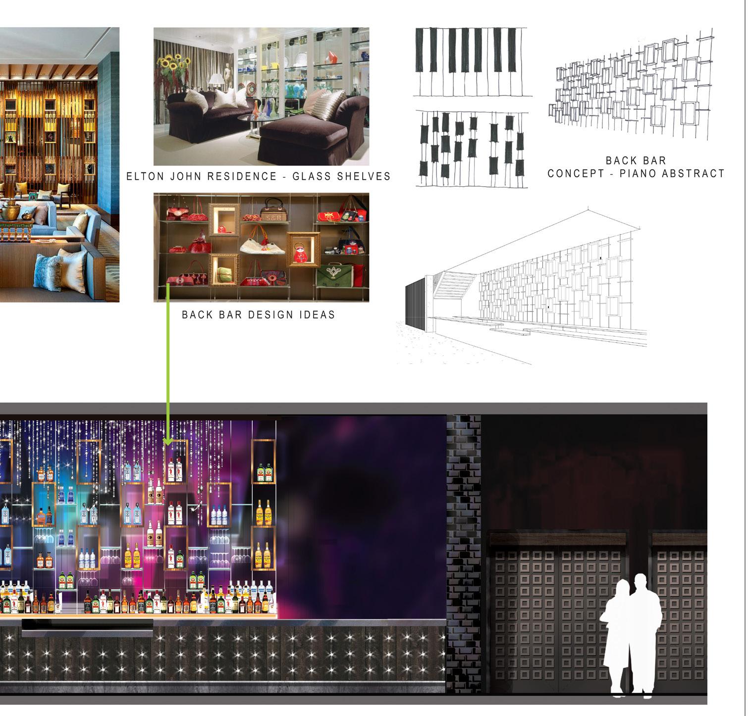 The back bar design was inspired by Elton’s music background -pianist. The abstract between the relationship of a solid and void connection. Inspirations from his home and his eyeware collection played a big part in this design.