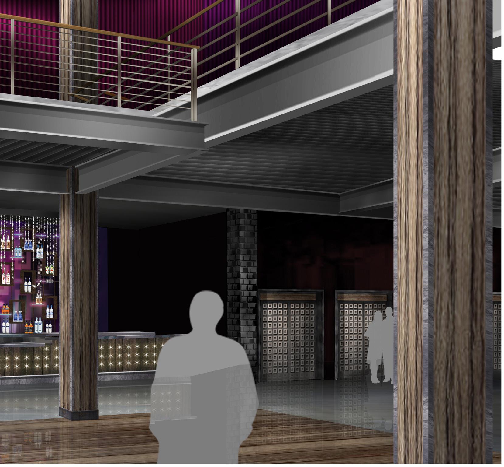 The “Skeleton Bar” is located on the Mezzanine level. The inspiration behind this bar was to use the “Roxy” logo for it’s form and maintain a rustic theme. The steel rods held the circular forms together.
