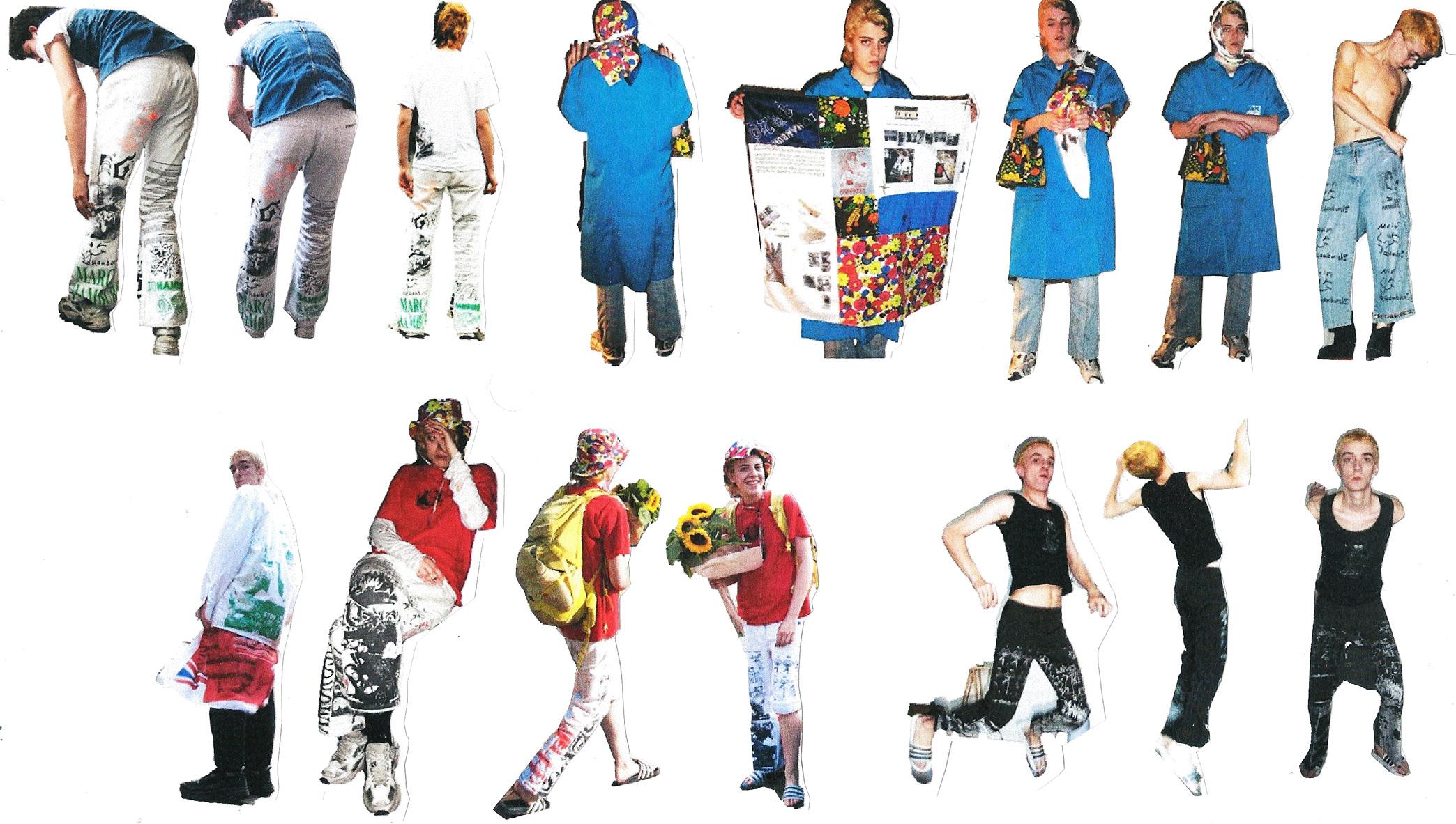 Llamé a tres amigxs de Barcelona y les pedí un diseño de 45x45cm para crear una pieza colectiva que estampé en pañuelos y pantalones. Experimentar la ropa en la calle fue uno de los objetivos del proyecto. Colaboración con Yago Antón, Ada Fontecilla y Enric Canal.