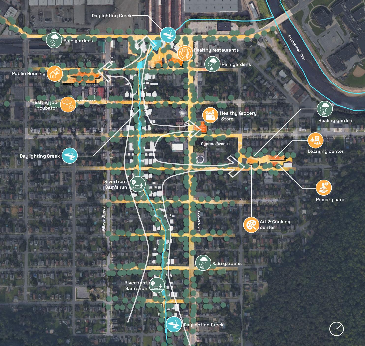 Reimagining Johnstown’s Moxham, this project transforms Sam’s Run with innovative green infrastructure. Daylighting channelized streams improves water quality, reduces flood risks, and fuels local entrepreneurship, affordable housing, and community hubs—revitalizing an industrial legacy with sustainable, water-based interventions.