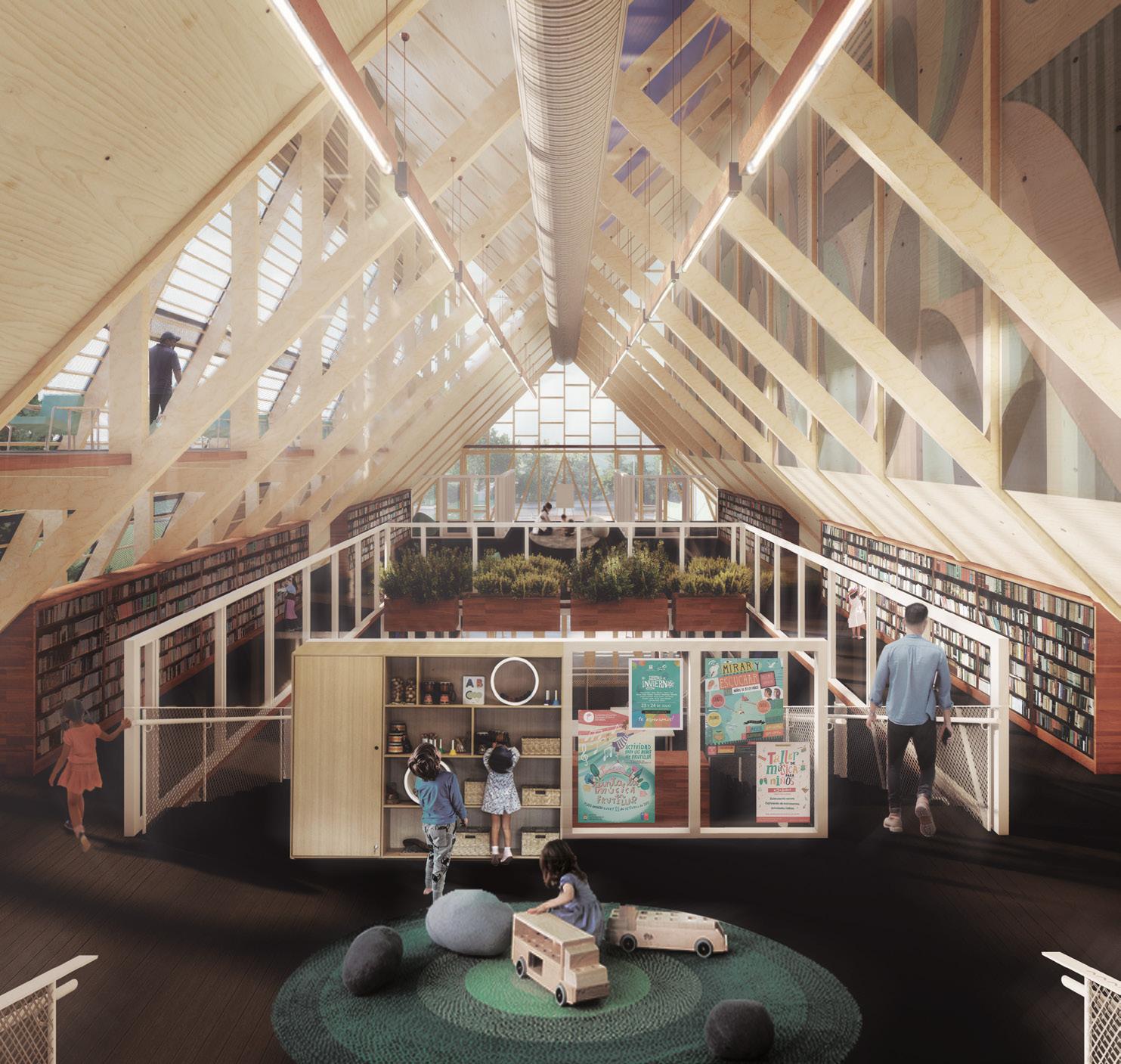 The Public Library in Valdivia competition reimagines a regional library and archive for Los Ríos, Chile. Two rotating volumes generate an intermediary space connecting city and tsunami-prone river. The design opens a public ground floor while elevating secure archive functions, separating public access and private storage.
