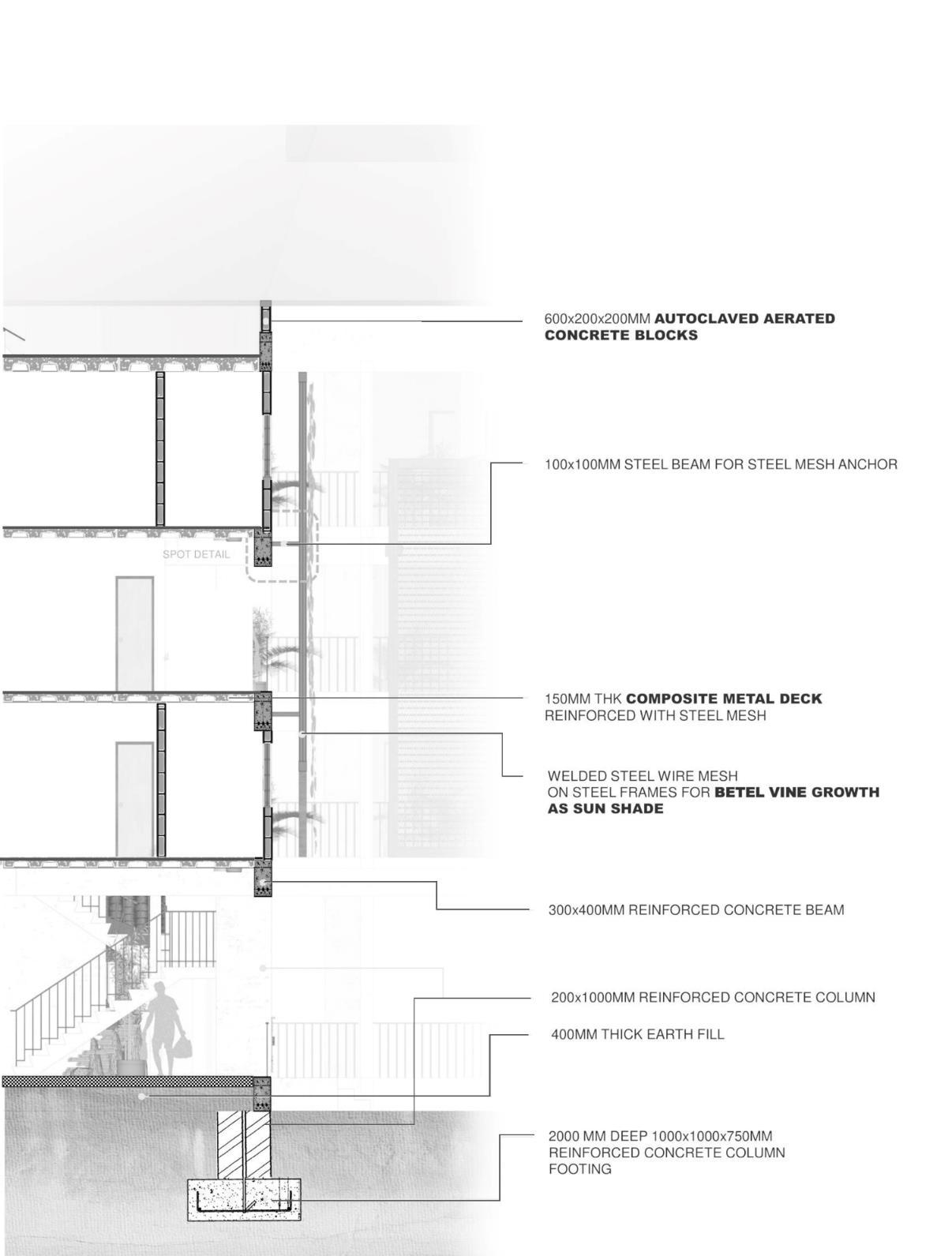 Regarding the sun heat and light mitigation, wire mesh-vine combination was applied at the rear elevation surface as sun shading device