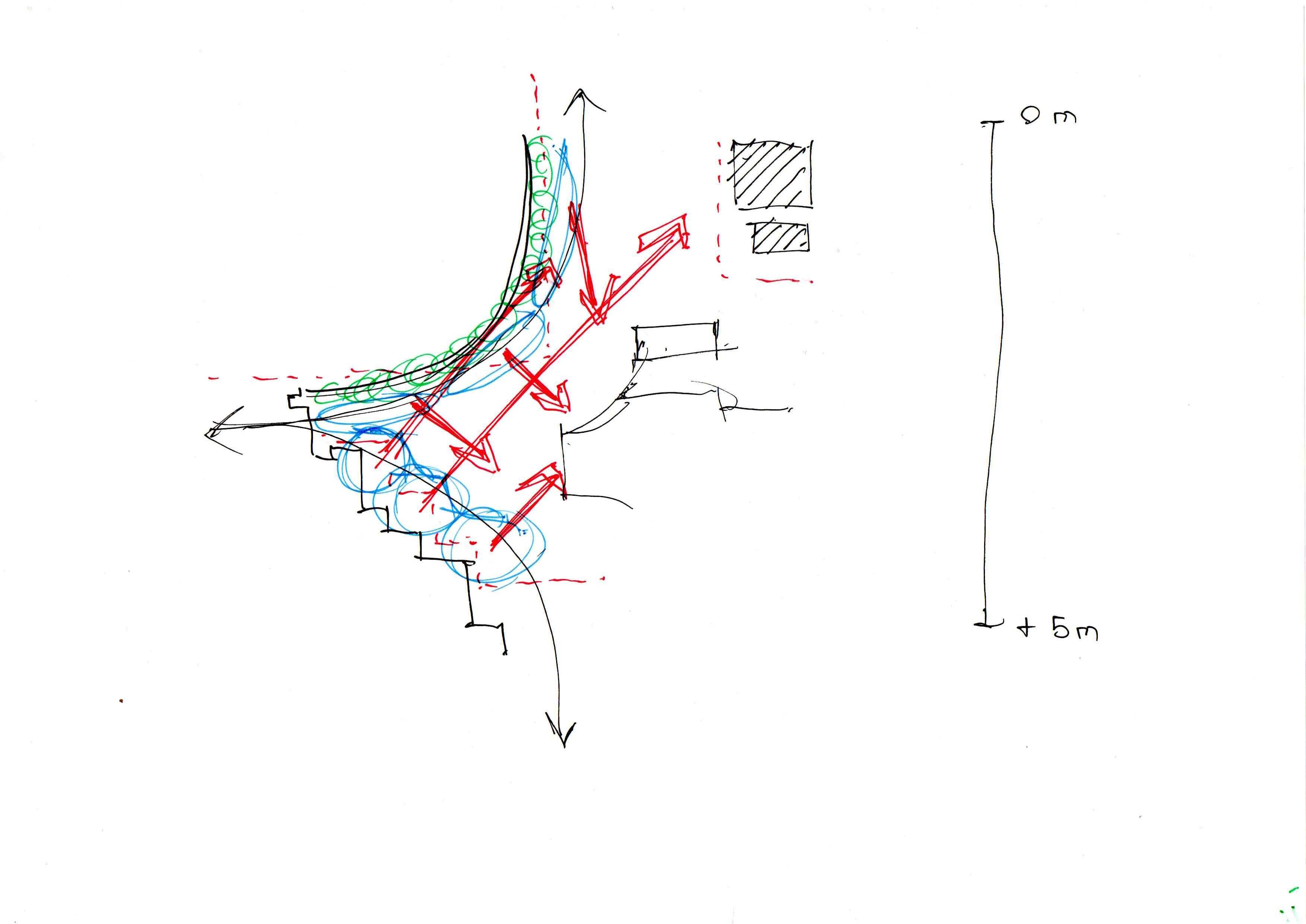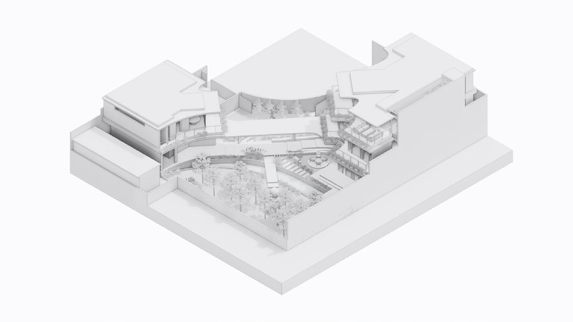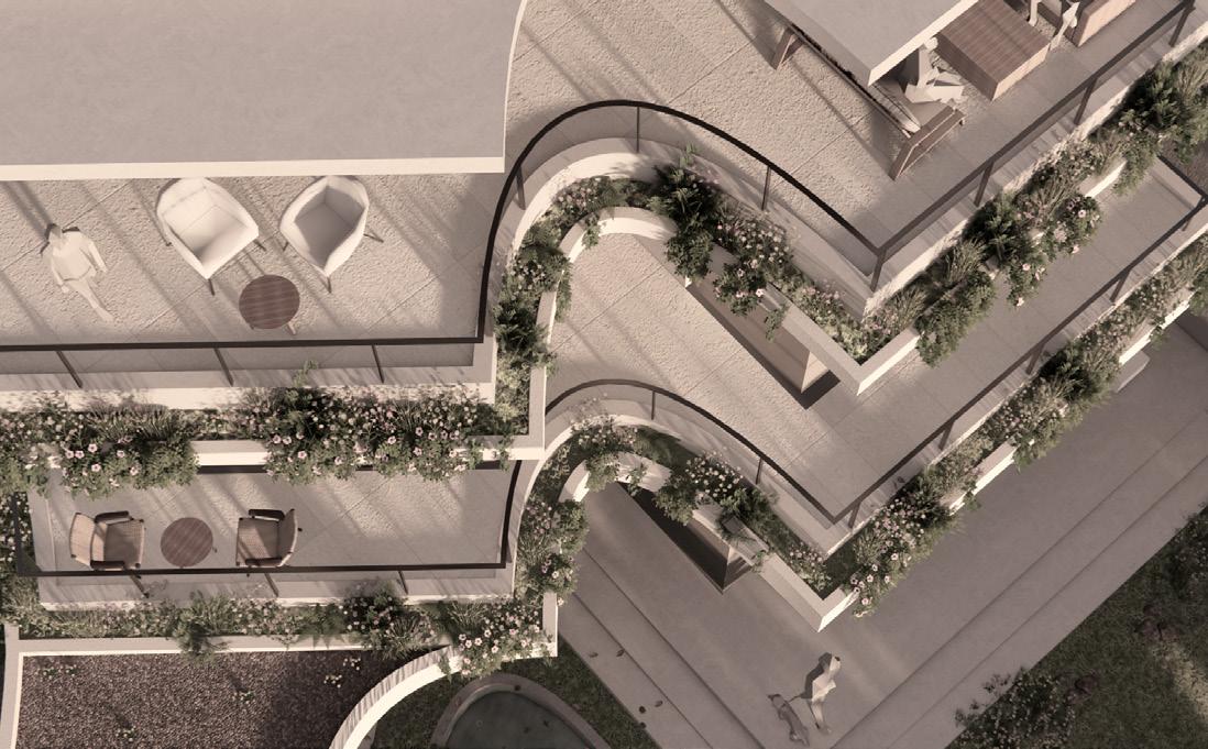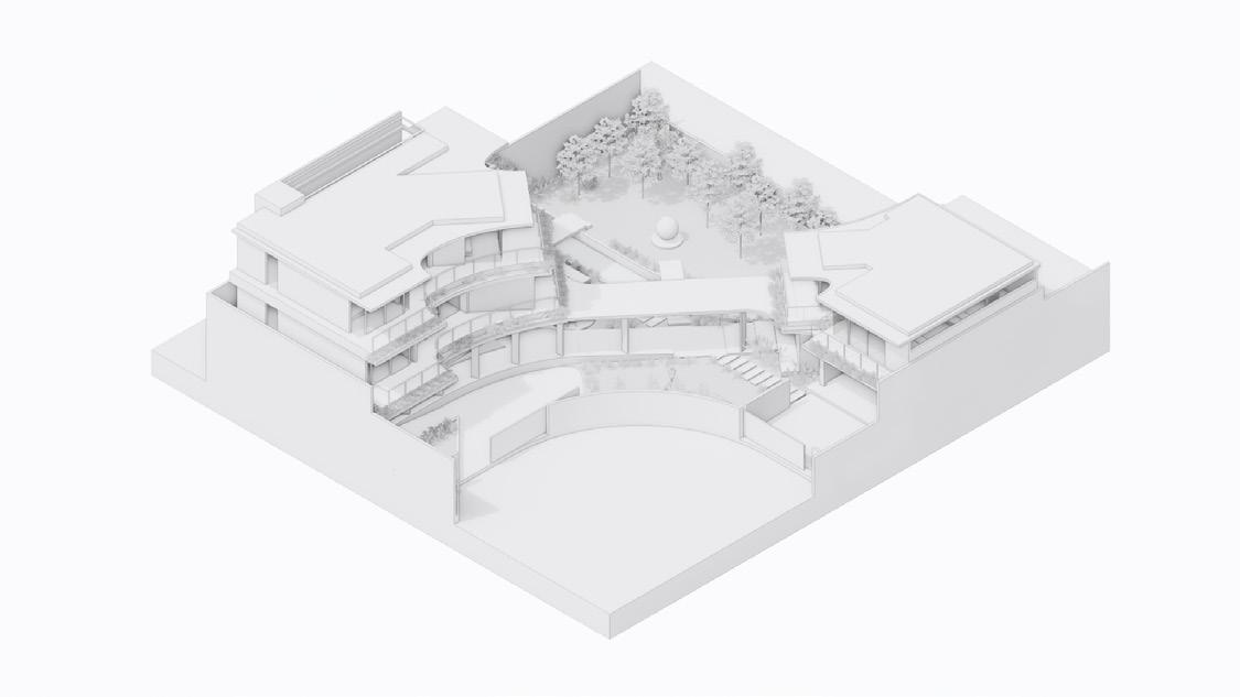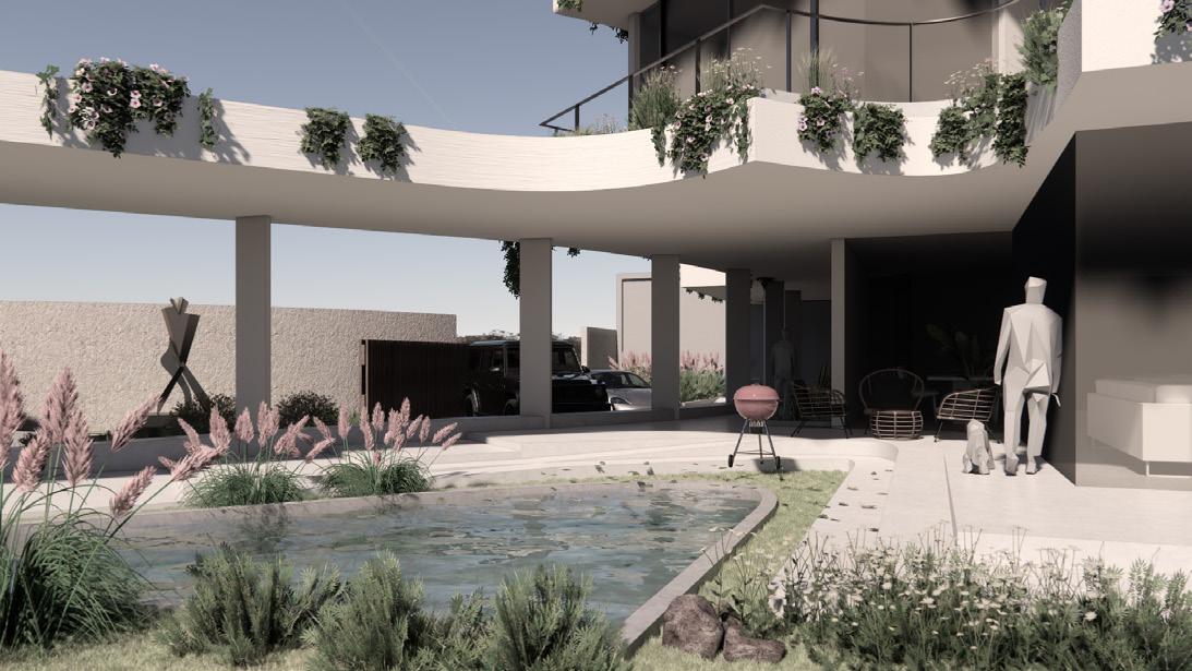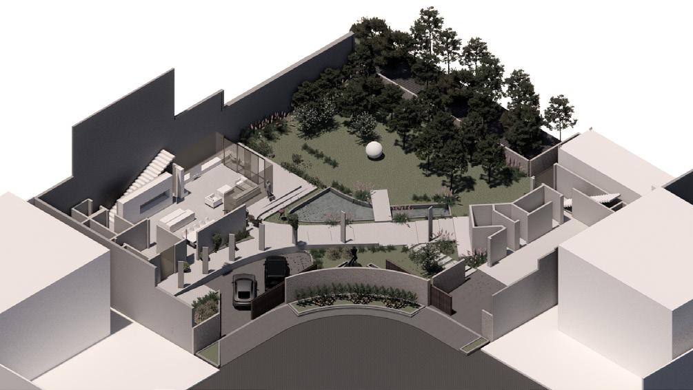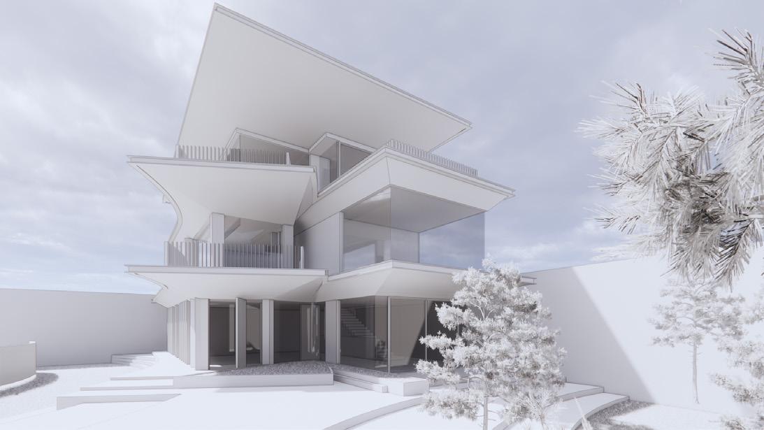 The house and office building are meticulously designed to respond to the site's unique corner location. The curvilinear and terraced forms are intended to blur the boundaries between the structures and the landscape, seamlessly integrating the two functions positioned at opposite ends of the site.