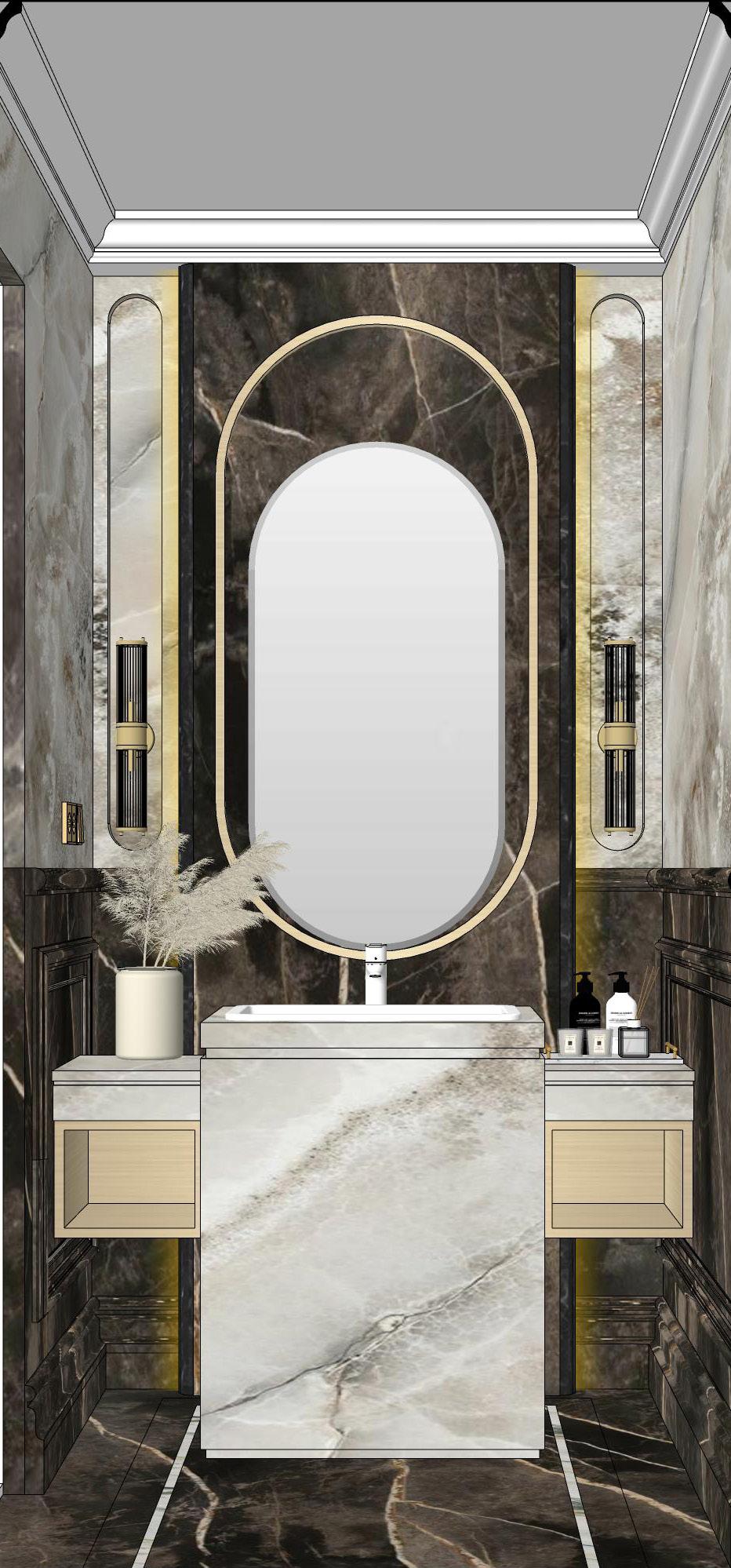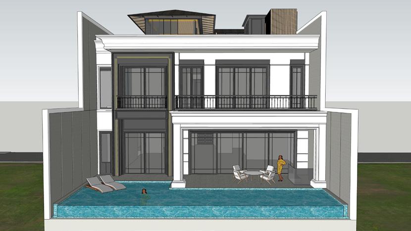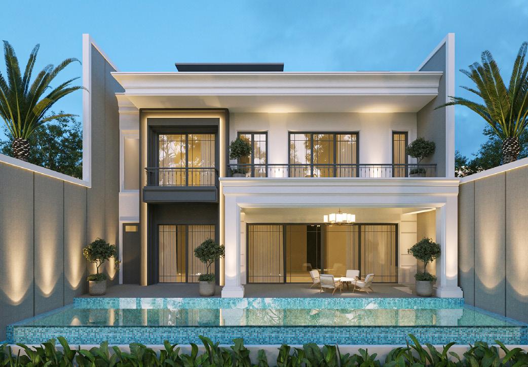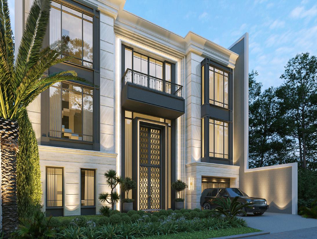 This classical-style home in Surabaya, Indonesia, embodies the client's vision for a modern classic residence. The design emphasizes simple forms and light profiles, with minimal ornamentation on the façade, while celebrating the symmetrical elegance of classical architectural elements. Natural stone is prominently featured, reinforcing the timeless quality of the design.