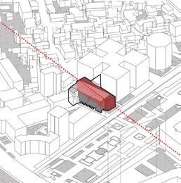 The initial massing maximises the buildable area within the statutory setback. A tower is added to accommodate the room programme, and the primary volume is split to orient the composition towards the junction while avoiding a direct axial thrust. Beneath the tower, the base is incised to create a permeable ground plane with a pavilion for the hotel’s traditional drink café. The final move is to visually soften the tower to foreground the street level facade.
