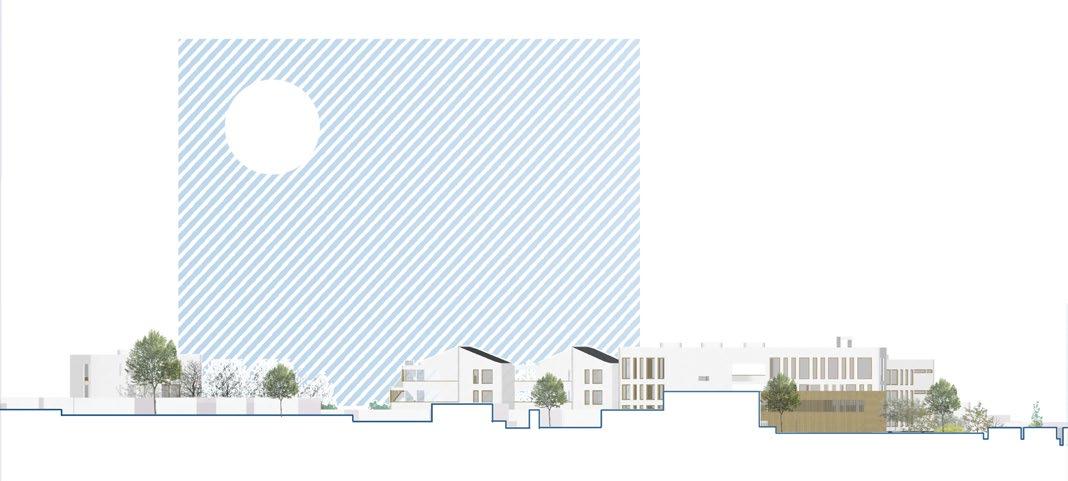 The initial massing places two elongated classroom blocks along the flat contour, connecting their ends to form a looped circulation and adding a central mass for administration and the sports hall. The wings are then raised and lowered to provide passive sun shading, with gaps between classrooms introduced to improve ventilation.