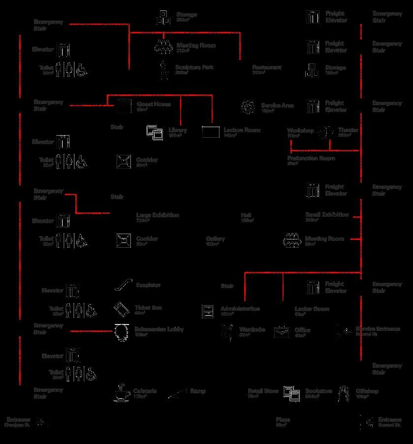To transform the museum into an urban gateway, the ground level is reimagined as an open communal ground, a sunken plaza that is freely accessible. The plan reverses the circulation flow to create a new spatial sequence while retaining the existing structure.