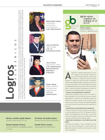 migo B.O.D. estrena nueva sección. Su nombre: “Gente B.O.D.” El propósito: resaltar la labor que desempeñan hombres y mujeres que con esfuerzo y dedicación hacen de nuestra institución un lugar para crecer personal y profesionalmente. Felipe Ortigoza inaugura este espacio, ya que con su trabajo diario dentro de la Vicepresidencia de Proyectos y Mantenimiento hace que cada una de las estructuras físicas y oficinas del Banco permanezcan en óptimo estado para la comodidad de clientes y empleados. - ¿Cómo es una jornada laboral en el banco? - Mis labores comienzan todos los días a las 6:00 a.m. Estoy disponible las 24 horas del día porque en nuestro departamento no sabemos qué novedades puedan presentarse en cualquier sucursal. Somos un grupo conformado por ocho personas, dividido en unidades integradas por dos personas que cada semana asumimos guardias de 24 horas. - ¿Cómo fueron sus inicios dentro de la Institución? - Empecé a trabajar en el banco a través de una contratista, aproximadamente en el año 1992. Me gustó mucho el trabajo que desempeñé en ese entonces y como tenía ciertos conocimientos y había una vacante en el área que requerían, luché hasta que conseguí el empleo. - ¿Qué siente al pertenecer a una familia como la del B.O.D.? - Me siento muy orgulloso. Somos una familia muy apegada. Hay mucha comunicación y respeto. Estoy muy agradecido porque he recibido mucha ayuda por parte de mis compañeros.