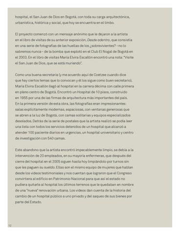 hospital, el San Juan de Dios en Bogotá, con toda su carga arquitectónica, urbanística, histórica y social, que hoy se encuentra en el limbo. El proyecto comenzó con un mensaje anónimo que le dejaron a la artista en el libro de visitas de su anterior exposición, Desde adentro, que consistía en una serie de fotografías de las huellas de los ¿sobrevivientes? –no lo sabremos nunca– de la bomba que explotó en el Club El Nogal de Bogotá en el 2003. En el libro de visitas María Elvira Escallón encontró una nota: “Visite el San Juan de Dios, que se está muriendo”. Como una buena secretaria (y me acuerdo aquí de Coetzee cuando dice que hay ciertos temas que lo convocan y él los sigue como buen secretario), María Elvira Escallón llegó al hospital en la carrera décima con calle primera en pleno centro de Bogotá. Encontró un Hospital de 10 pisos, construido en 1955 por una de las firmas de arquitectura más importantes del país. En la primera versión de esta obra, las fotografías eran impresionantes: salas explícitamente modernas, espaciosas, con ventanas generosas que se abren a la luz de Bogotá, con camas solitarias y equipos especializados desolados. Detrás de la serie de postales que la artista realizó se podía leer una lista con todos los servicios detenidos de un hospital que alcanzó a atender 100 paciente diarios en urgencias, un hospital universitario y centro de investigación con 540 camas. Este abandono que la artista encontró impecablemente limpio, se debía a la intervención de 20 empleados, en su mayoría enfermeras, que después del cierre del hospital en el 2005 siguen hasta hoy limpiándolo por turnos sin que les paguen su sueldo. Ellas son el mismo equipo de mujeres que hablan desde los videos testimoniales y nos cuentan que lograron que el Congreso convirtiera al edificio en Patrimonio Nacional para que así el estado no pudiera quitarle al hospital los últimos terrenos que le quedaban en nombre de una “nueva” renovación urbana. Los videos dan cuenta de la historia del cambio de un hospital público a uno privado y del saqueo de sus bienes por parte del Estado.
