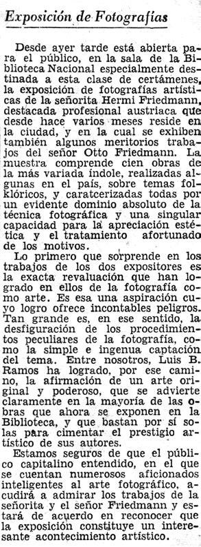 No será diferente la impresión si observamos también las fotografías Tranvía incendiado y destruido durante el Bogotazo (la segunda del libro), Mujer campesina en Boyacá (página 8), Hans Kappelmacher en plena función (pag. 46), Tradición y modernidad en Magangué (pag. 95), Frailejones en el Parque Nacional Chingaza (pag. 114-115), Panorámica de Bogotá (pag. 137) y, sobre todo, el extraordinario Retrato de cacique kuna de San Blas, Panamá (pag. 67), solo para señalar imágenes que de alguna manera inauguran series e intereses fotográficos de Hermi Friedmann.