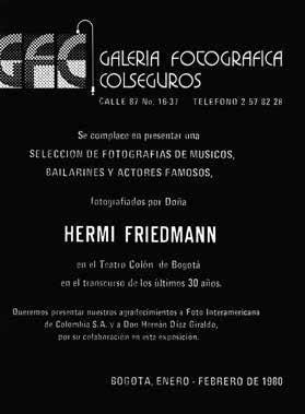 * Nota de la editora: el Teatro Colón de Bogotá, escenario que forma parte del Centro Nacional de las Artes Delia Zapata Olivella, custodia algunos programas de mano que dan cuenta de la programación de conciertos, obras de teatro, óperas y recitales, entre otros eventos, así como de fotografías realizadas por Hermi durante las décadas de 1940 a 1970, aproximadamente. A través de las fotografías tomadas por Hermi Friedmann —tanto las que custodia la familia de la fotógrafa como las que se encuentran en el teatro, y de la mano de estos programas de mano—, podría leerse no solo la historia de este lugar a mediados de siglo XX, sino también contar con un panorama amplio de cuál era la movida artística que presenció la capital del país durante este periodo. Este capítulo es una invitación a investigar acerca de la escena artística de Bogotá mediante la indagación de archivos documentales como el del Colón contando con el registro fotográfico realizado por Hermi.