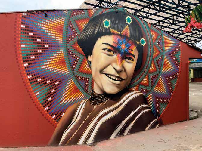 JULIÁN MUÑOZ (ROJOR) Y FELIPE CÉSPEDES. MURAL REALIZADO EN SIBUNDOY, PUTUMAYO, A PARTIR DE LA FOTOGRAFÍA DE HERMI FRIEDMANN, EN HOMENAJE AL TAITA SILVESTRE CHINDOY EN SU JUVENTUD, QUIEN FUE UN LÍDER DE LA COMUNIDAD CAMËNTSÁ, 2020.