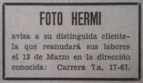 54 Resulta complejo que el reportaje no mencione a quién se refiere con “el fotógrafo”. ¿Acaso las fotografías del reportaje no fueron tomadas por Hermi? Para ese momento, los reportajes de revista Cromos solían omitir el crédito del reportero gráfico, contrario a lo que pasaba en otras revistas como Semana en la cual, desde 1946, junto a cada fotografía publicada se especificaba el nombre de quien había tomado la fotografía. Lo complejo es si, además de la tradición de negar el crédito de autoría, se niegue —en el caso de que haya sido de Hermi— la mención al género de la fotógrafa.