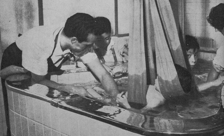 un doctor baña a un niño en la sociedad pro-ayuda del niño lisiado, hacia 1964. Sociedad Pro-Ayuda del Niño Lisiado: Memoria 1964, Santiago, Stanley, 1965. Colección Biblioteca Nacional de Chile.