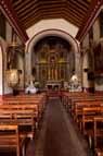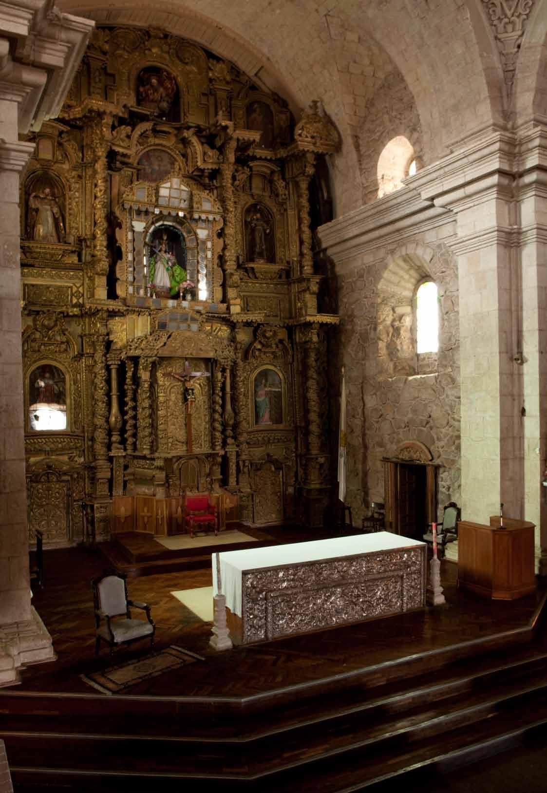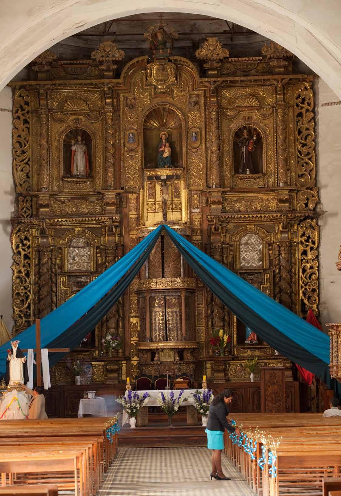 Su altar principal es de piedra pintada, de tres cuerpos y tres calles en una sencilla pero festiva amalgama de culturas andinas y europeas. Construido en piedra y