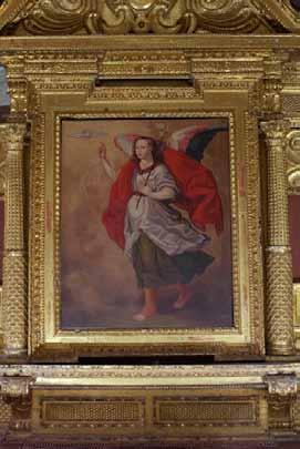 estucado en yeso, está pintado con aplicaciones doradas, todo enmarcado en columnas cilíndricas de fuste liso. Enriquecido por la proliferación de imágenes sagradas, constituye una obra de arte de la imaginería barroca andina.