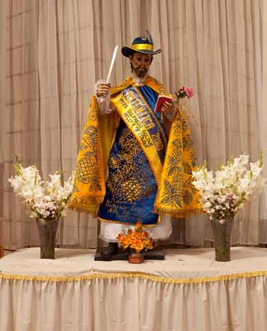 Arcángel en combate contra el mal, San Cristóbal con el niño Dios en sus hombros y San Jorge venciendo al dragón. Los músicos muestran en sus ropas la amalgama de los dos mundos, calzones hispanos y mantas andinas.