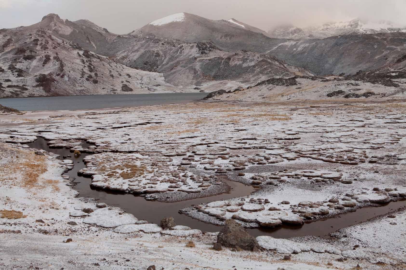 pueblo a los pies del volcán Parinacota y su mellizo el Pomerape, a 4.392 metros de altitud. El gran bofedal que lo enfrenta lleva el mismo nombre, Parinacota, o “laguna de flamencos” en aimara.