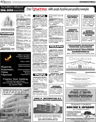 ΤΕΣΣΑΡΙΑ . ΕΝΟΙΚΙΑΖΕΤΑΙ ΜΟΝΟΚΑΤΟΙΚΙΑ στην Αµαλιάδα, εντός πόλεως 115 µ², δύο υπνοδωµάτια, θέρµανση, καλοριφέρ, τζάκι, αυλή, αποθήκη. Τιµή λογική. Πληρ. τηλ. 6937742636. ΜΑ8242 --------------------------------. ΣΤΗΝ ΠΑΤΡΑ ΕΝΟΙΚΙΑΖΕΤΑΙ 4ΑΡΙ στις εργατικές κατοικίες ΤΑΡΑΜΠΟΥΡΑ επί της ΑΚΡΩΤΗΡΙΟΥ, αυτόνοµη θέρµανση, χωρίς κοινόχρηστα, ανοιχτό πάρκινγκ πλησίον ΤΕΙ, τιµή ενοικίασης 285 Ε. Πληρ. τηλ. 26230/92243. ΜΑ8239 --------------------------------. ΕΝΟΙΚΙΑΖΕΤΑΙ ΜΟΝΟΚΑΤΟΙΚΙΑ 114µ² περιοχή Βαρβάσαινας µε αυτόνοµη θέρµανση και πανοραµική θέα – χωρίς κοινόχρηστα. Πληρ. τηλ. 6972602786, 26210/29789. ΜΑ8273 --------------------------------. ΕΝΟΙΚΙΑΖΕΤΑΙ ΣΤΗΝ ΑΜΑΛΙΑ∆Α ∆ΙΠΛΟΚΑΤΟΙΚΙΑ, 132 µ², τέρµα Καλαβρύτων, µε αυτόνοµη θέρµανση, τζάκι, a/c, γύρωθεν µπαλκόνια, 2 µπάνια, parking, χωρίς κοινόχρηστα. Πληρ. τηλ. 6972883201, 26220/25669. ΜΑ8308