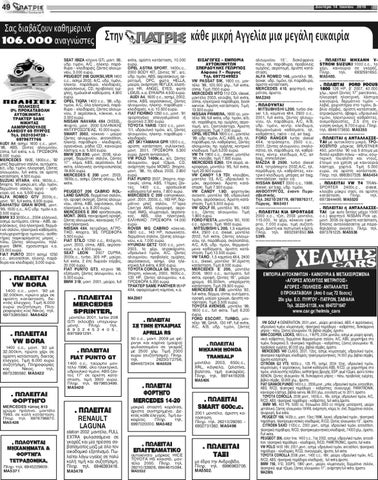 SEAT IBIZA κίτρινο GTi, µοντ. 98, υδρ. τιµόνι, A/C , ηλεκτρ. παράθυρα – κλειδαριές, ζάντες αλουµινίου, 3.000 ευρώ. PEUGEOT 206 QUIKSILVER 1400 c.c., ασηµί 2002, A/C, υδρ. τιµόνι, ηλεκτρ. παράθυρα, κλειδαριές, αερόσακους, CD, προβολείς οµίχλης, ηµιbucket καθίσµατα, 4.900 ευρώ. OPEL TIGRA 1400 c.c., ’98, υδρ. τιµόνι, A/C, όλα ηλεκτρικά, παράθυρα – κλειδαριές, ζάντες αλουµινίου, 2 αερόσακοι, κόκκινο, κ.α. 3.000 ευρώ. NISSAN NAVARA 4X4 DIESEL, 4πορτο, µοντ. 2000 ΕΛΛΗΝΙΚΗΣ ΑΝΤΙΠΡΟΣΩΠΕΙΑΣ, 10.000 ευρώ. SMART 2002, κόκκινο – µαύρο ζάντες αλουµινίου, aircondition, ηλεκτρ. παράθυρα – κλειδαριές, οργανάκια, ράδιο CD, καινούρια λάστιχα, κ.α. 5.500 ευρώ. BMW 320 E90, µοντ. 2006, ηλιοροφή, δερµάτινο σαλόνι, ζάντες 17”, κλίµα, ABS, αερόσακοι, full extra, ελληνικής αντιπροσωπείας 19.800 ευρώ. MERCEDES E 200 µοντ. 2003, 1800c.c., ασηµί, ζάντες αλουµ., full extra. . PEUGEOT 206 CABRΙΟ ROLLAND GAROS, δερµάτινο σαλόνι, ηλ. οροφή σκληρή, ζάντες αλουµινίου, clima, ABS, αερόσακοι, όλα ηλεκτρικά, κ.α. 8.200 ευρώ. MERCEDES E 200 sportscoupe, ΜΟΝΤ. 2003, πανοραµική οροφή, ζάντες αλουµινίου, καινούριες 17”, όλα ηλεκτρικά. NISSAN 4X4, πετρέλαιο, ΑΓΡΟΤΙΚΟ, 4πορτο, ’93, ΠΡΟΣΦΟΡΑ 5.500 ευρώ. FIAT STILO 1250 c.c., 6τάχυτο, µοντ. 2003, clima, ABS, αερόσακους, κ.α. 4.500 ευρώ. SEAT LEON 2007 CUPRA, 2000c.c., turbo, 305 ΗΡ, µαύρο, full extra, 2 έτη δωρεάν σέρβις, 20.000 ευρώ. FIAT PUNTO GT3, κίτρινο ’98, εξάτµιση, ζάντες αλουµινίου, κ.α. 5.000 ευρώ. BMW 318, µοντ. 2001, µαύρο, full