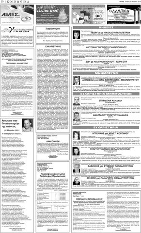 ΕΤΩΝ 88 Θανούσα κηδεύοµε σήµερα Τετάρτη 20 Μαρτίου και ώρα 4.00µ.µ. από τον Ιερό Ναό Αγ. Γεωργίου Παλαιοχωρίου και παρακαλούµε τους συγγενείς και φίλους όπως προσέλθουν και παρακολουθήσουν την εκφορά της. Παλαιοχώρι 20 Μαρτίου 2013 ΤΑ ΤΕΚΝΑ ΤΑ Α∆ΕΛΦΙΑ ΤΑ ΑΝΙΨΙΑ ΟΙ Λ. ΣΥΓΓΕΝΕΙΣ ΓPAΦ. TEΛETΩN: ΓEΩPΓIOY KΛAMΠANOY Tηλ. 26230/55255 και 22776- 697/7011926 ΑΝ∆ΡΑΒΙ∆Α -ΛΕΧΑΙΝΑ