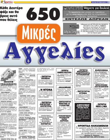650 Καθηµερινά από ∆ΕΥΤΕΡΑ ΕΩΣ ΚΑΙ ΠΑΡΑΣΚΕΥΗ από 8.30 π.µ. έως 11.00 µ.µ., ΣΑΒΒΑΤΟ από 8.30 π.µ. έως 8.00 µ.µ. και ΚΥΡΙΑΚΗ από 9.00 π.µ. έως 10.00 µ.µ. µπορείτε να παραδίδετε τις αγγελίες σας στα γραφεία της «Π» οδός Θεµιστοκλέους 13 για να δηµοσιευθούν από την επόµενη ηµέρα