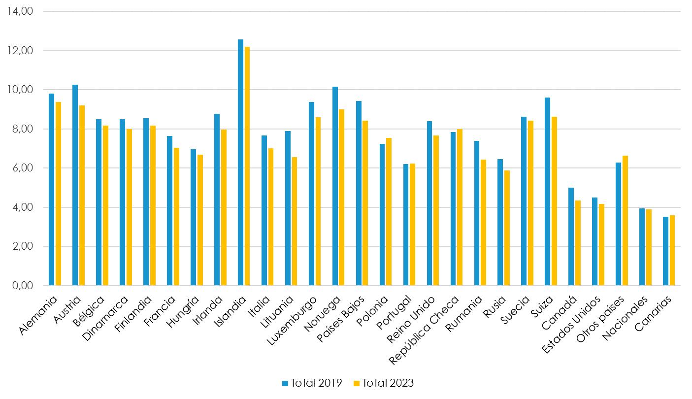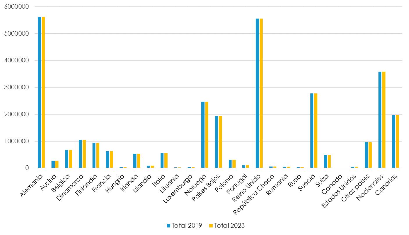 COUNTRY OF ORIGIN Total 2019 Total 2023 Var. 19-23 Var. (%) 19-23 UNITED KINGDOM 814.549 928.636 114.087 14,01% GERMANY 878.511 834.470 -44.041 -5,01% NORWAY 334.333 284.552 -49.781 -14,89% THE NETHERLANDS 231.325 266.199 34.874 15,08% SWEDEN 307.048 232.802 -74.246 -24,18% DENMARK 164.245 176.555 12.310 7,49% ITALY 94.608 119.370 24.762 26,17% IRELAND 87.656 108.298 20.642 23,55% FINLAND 134.343 105.459 -28.884 -21,50% BELGIUM 101.653 103.380 1.727 1,70% FRANCE 60.487 98.940 38.453 63,57% SWITZERLAND 101.806 97.992 -3.814 -3,75% POLAND 52.350 62.972 10.622 20,29% MOROCCO 49.561 61.295 11.734 23,68% PORTUGAL 65.101 57.706 -7.395 -11,36% AUSTRIA 35.490 44.578 9.088 25,61% MAURITANIA 22.732 22.628 -104 -0,46% OTHER COUNTRIES 76.560 86.545 9.985 13,04% TOTAL 3.612.358 3.692.377 80.019 2,22%