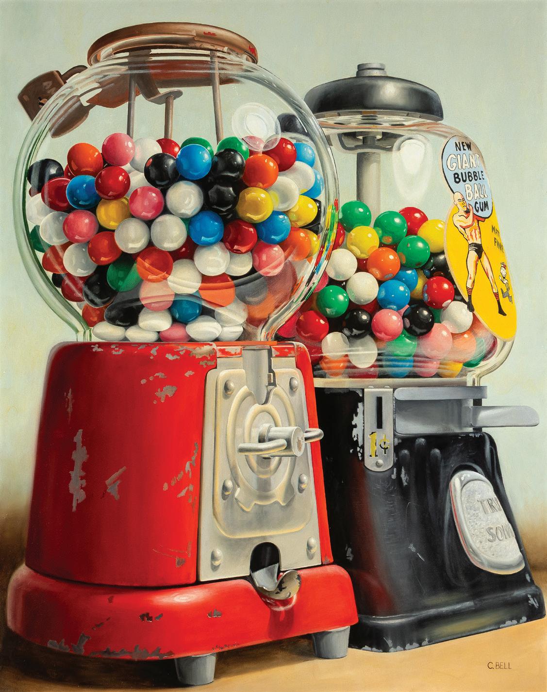 Angelle says, “then bought the painting about six months in.” That obsession is over, he reports, but the painting endures. (“I was so invested.”) Angelle’s favorite piece is of what he calls “nothing, but painted so perfectly.” It is a stark scene of two box fans in a window by Christopher Culver. Another artist with several works in the collection is Angelle himself. As an antidote, perhaps, to working with things designed by others all day, he paints abstracts and quirky details. “My own art is a physical expression of me needing a creative outlet,” he says—after some thought.