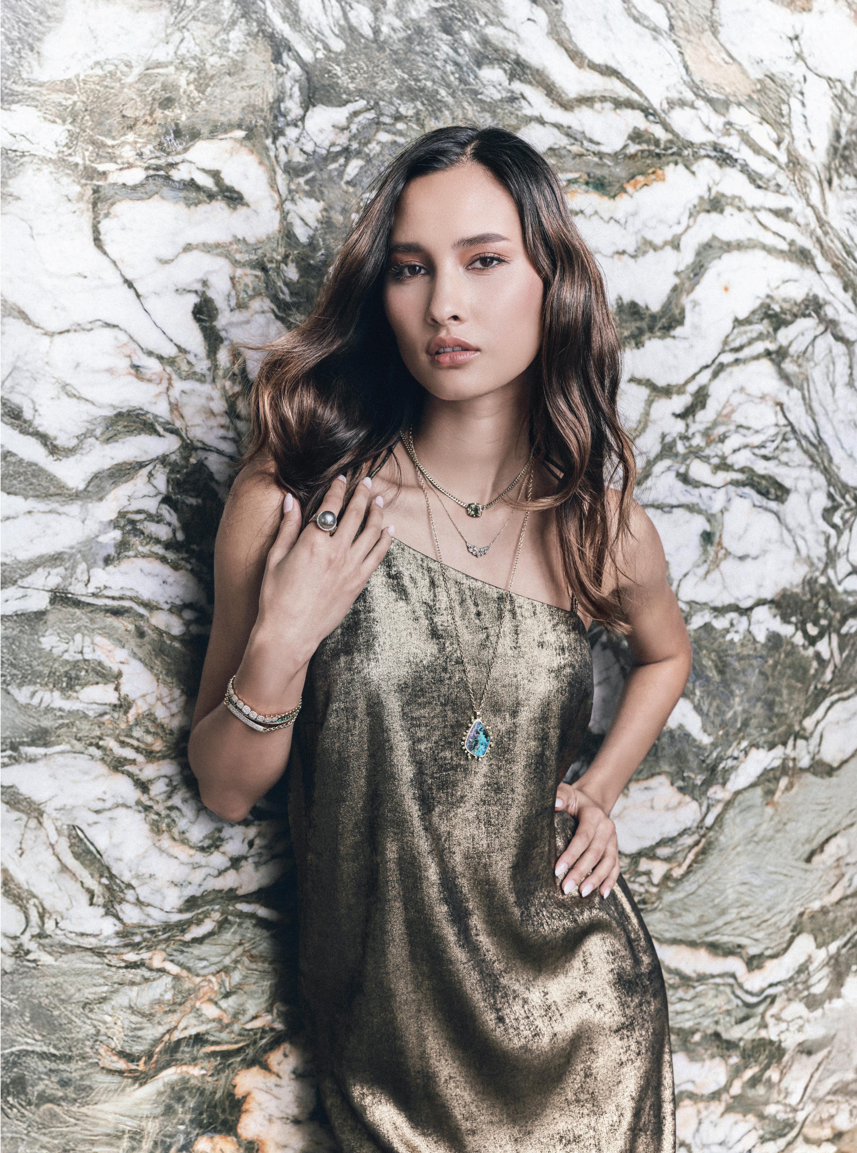 is a creative director and stylist with a passion for anything sparkly. Inspired by the natural iridescence found in stone, she drew on her years of experience in luxury retail to collaborate with Richardsonbased Texas Counter Fitters. Culled from an expansive inventory, each stone—chosen for its unique veining, color, and luminosity—served as a stunning backdrop for fine and artisan jewelry with seasonal fashion in Dazzling Encounters