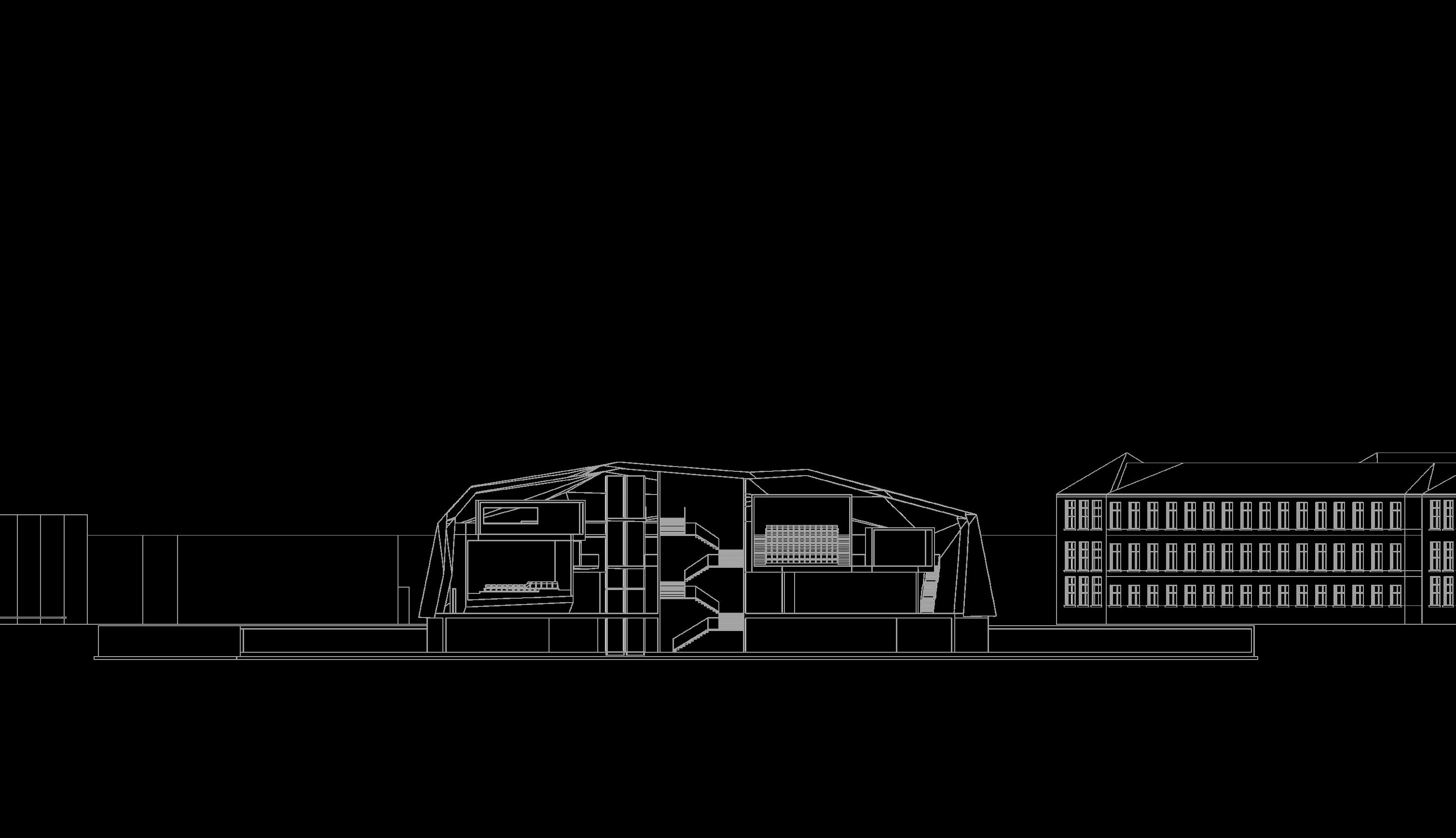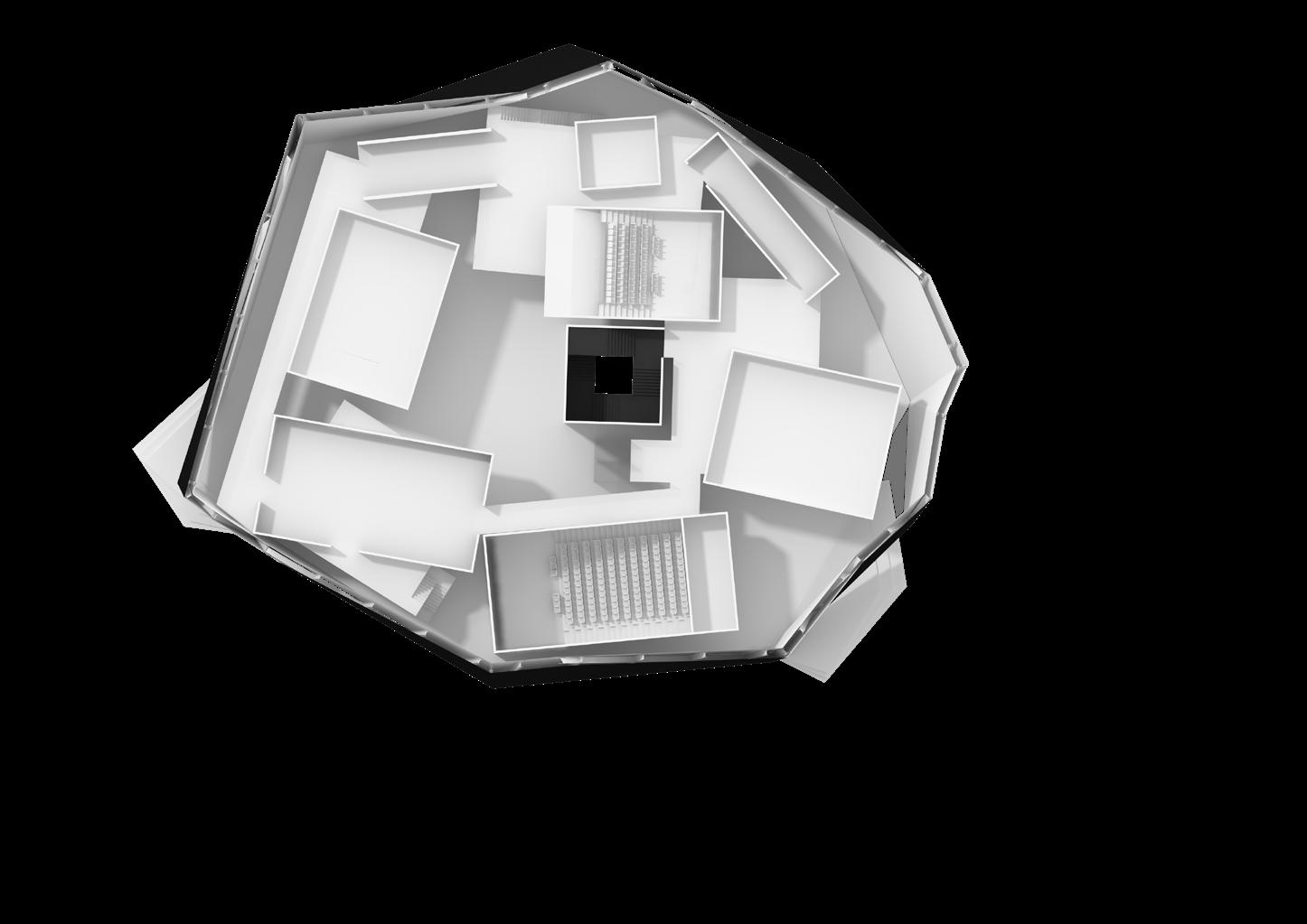 Poziom 0 przestrzeń ekspozycyjna | 1 taras widokowy | 2 informacja | 3 pokój ochrony | 4 administracja | 5 archiwum | 6 magazyny | 7 pracownie archeologiczne | 8 część gastronomiczna | 9