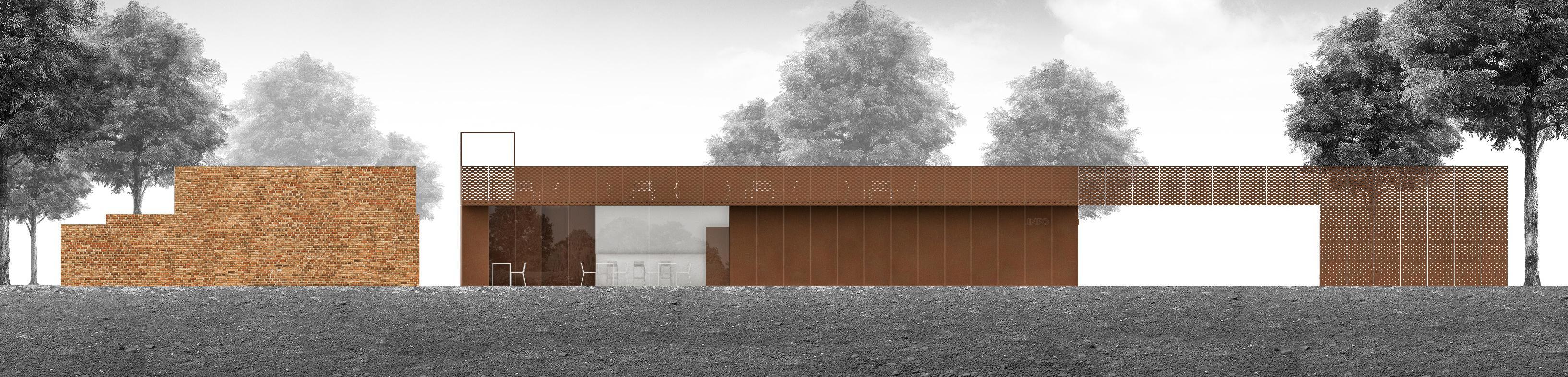 Elementy znajdujące się w płaszczyźnie historycznego przebiegu nieistniejących murów miejskich zostały zaprojektowane z perforowanych, płyt wykonanych ze stali kortenowskiej. Otwory tworzące perforacje są współczesną interpretacją cegieł, stanowiących budulec średniowiecznego muru. Zastosowanie przeziernego materiału sprawia, że elementy elewacji budynku pozostawiają pośredni widok na istniejące ruiny muru, jak i na rzekę Słupię, ponadto odróżniają tą część kubatury od pozostałych elewacji budynku. Obiekt został wykonany w konstrukcji żelbetowej. Zewnętrznym jak i wewnętrznym materiałem wykończeniowym w całym budynku są płyty ze stali kortenowskiej. Konstrukcja budynku oraz użyte w projekcie materiały uwzględniają całoroczną eksploatację obiektu. Ponadto w projekcie zastosowane zostało oświetlenie, w postaci wąskich pasów led, wzdłuż historycznego przebiegu murów aby jeszcze bardziej podkreślić ich przebieg. Projektowany budynek ma być wyposażony w niezbędne instalacje w tym wodno-kanalizacyjną, instalację elektryczną, wentylację mechaniczną, internet i monitoring. Podstawowe oświetlenie zewnętrzne to oświetlenie stref przedwejściowych kawiarni i toalet.