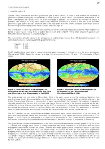 20 3. GREENHOUSE GASES 3.1 WATER VAPOUR Tyndall (1865) showed that the chief greenhouse gas is water vapour. In order to find whether the influence of greenhouse gases is changing, it is necessary to have a record of water vapour concentrations everywhere in the earth’s atmosphere for a past period. No such knowledge is possible, so no attempt to calculate its effects is possible. The attempt to study water vapour was therefore abandoned in favour of the next most important greenhouse gas, carbon dioxide. It reminds one of the story of the man who lost his wallet on a dark night and was found looking under the street lamp “because that’s where the light is”. The contribution of water vapour to the total greenhouse effect is difficult to assess because the infrared absorption bands of water vapour overlap those of carbon dioxide. Kiehl and Trenberth (1997) obtain a figure of approximately 60% of the total, but provide no uncertainty figures. The concentration of water vapour in the atmosphere is said to range between 0 and 4% but actual figures or even estimates are elusive. Humphreys (1942) gives the following: Equator 50ºN 70ºN