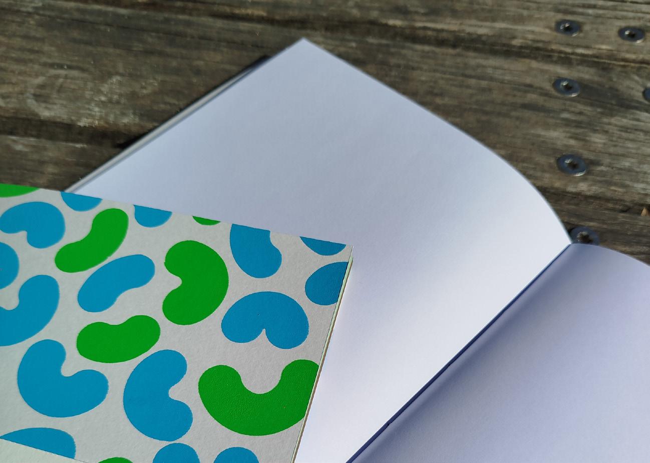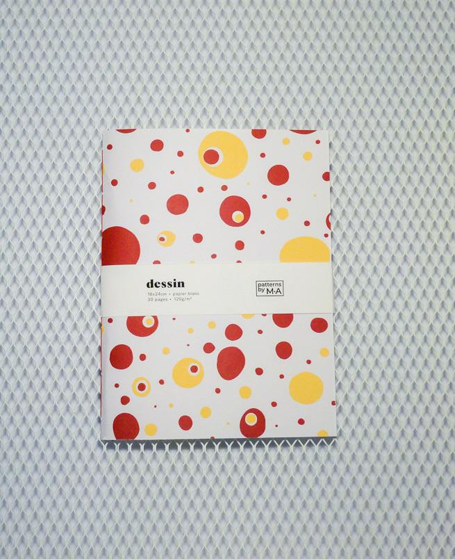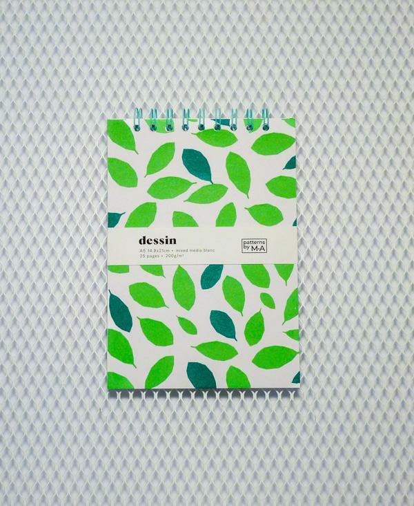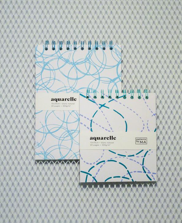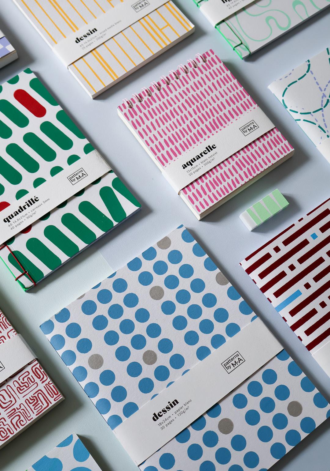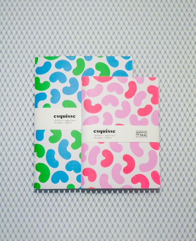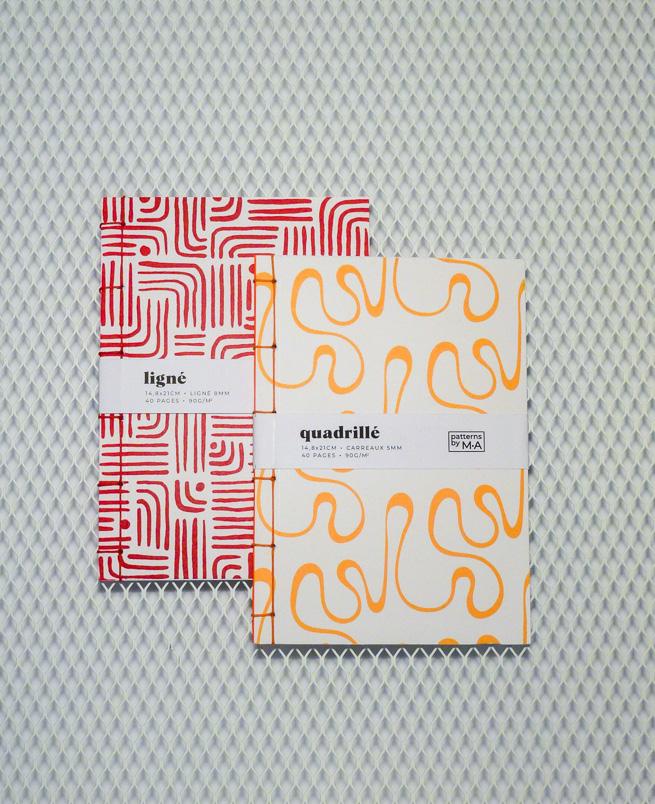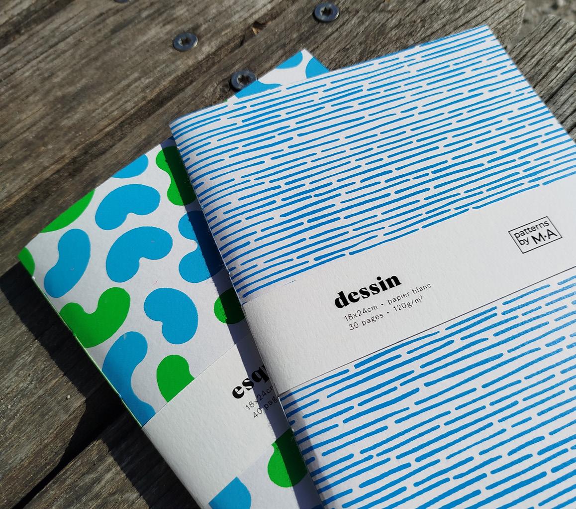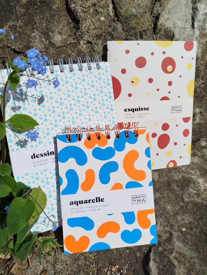 Mes patterns sont tous dessinés à la main, repris numériquement puis sérigraphiés dans mon atelier. Le travail de reliure est également fait à la main par mes soins.