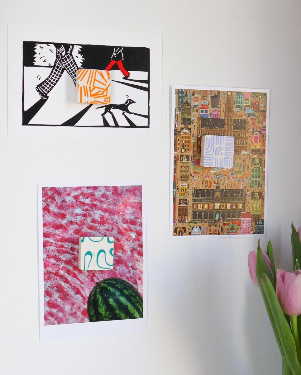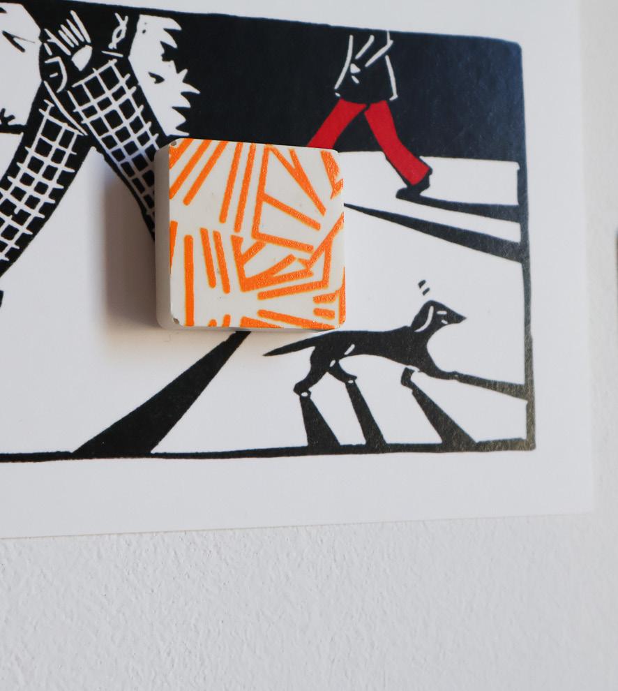 utilisation : aimant fabriqué et sérigraphié à la main, vendu avec une pastille magnétique autocollante à fixer sur n’importe qu’elle surface pour accrocher une photo au mur